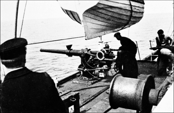 The look-out man aft is disguised as one of the Mercantile crew. The dummy