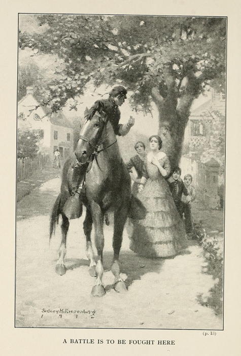 Then Mary Bowman looked down the street. In the Diamond the movement was more rapid, the crowd was thicker. Women had come out to the doorsteps, men were hurrying about. It seemed to Mary that she heard Mrs. Deemer scream. Suddenly there was a clatter of hoofs; a dozen soldiers, riding from the town, halted and began to question her. Their horses were covered with foam; they had come at a wild gallop from Seminary Ridge.
