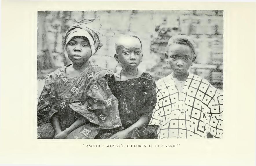 The men were Hausas or Wangaras, some wearing turbans, some with shaven heads, and clad in long, straight, shirt-like garments, while the women excited my deepest compassion. They may have been the men's wives, I know not; but by whatever name they were called they were slaves if ever I saw slaves. They had very little on besides a dirty, earthen-coloured cloth hitched round their loins, their dark faces were brutalised and depressed with that speechless depression that hardly realises its own woes, and their dusty hair that looked as if it had not been washed for years was generally twisted into short, thick, dusty looking plaits that were pressed downwards by the weight of the load they one and all carried. They carried children, too, on their backs, tiny babies that must have been born on the journey, or lusty youngsters that were a load in themselves. But a Hausa will carry an enormous load himself—sometimes up to 240 lbs.—so it is not likely he will have much consideration for his women. It may be, of course, that their looks belied them, but it seemed to me that they cared little whether Fate drowned them there in the swirling brown waters of the river or brought them safely through to the other side to tramp on, footsore, tired, weary, heartsick—if these creatures who looked like dumb beasts had life enough in them to be heartsick—to their destination three months away in the north.