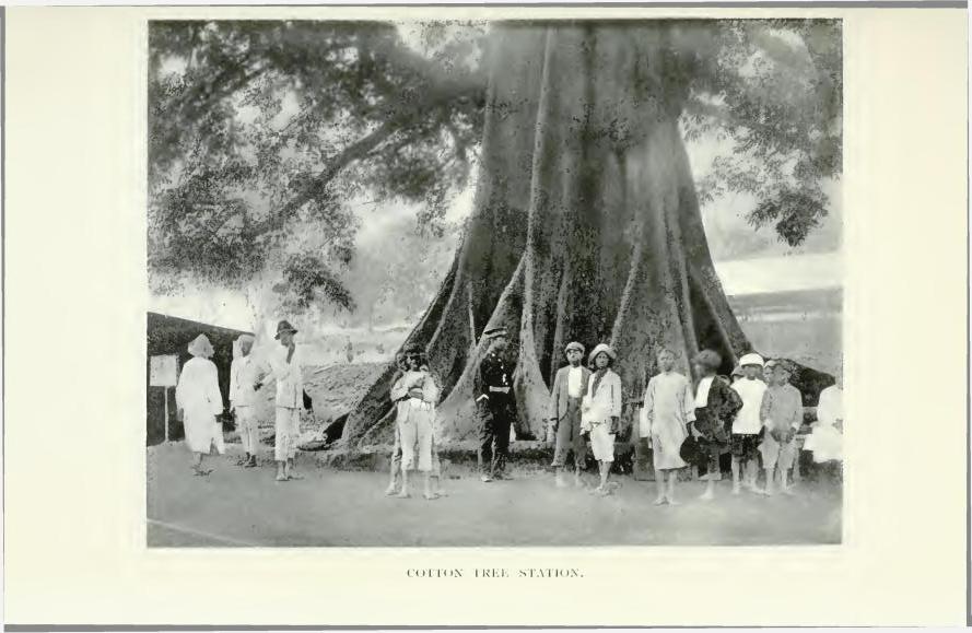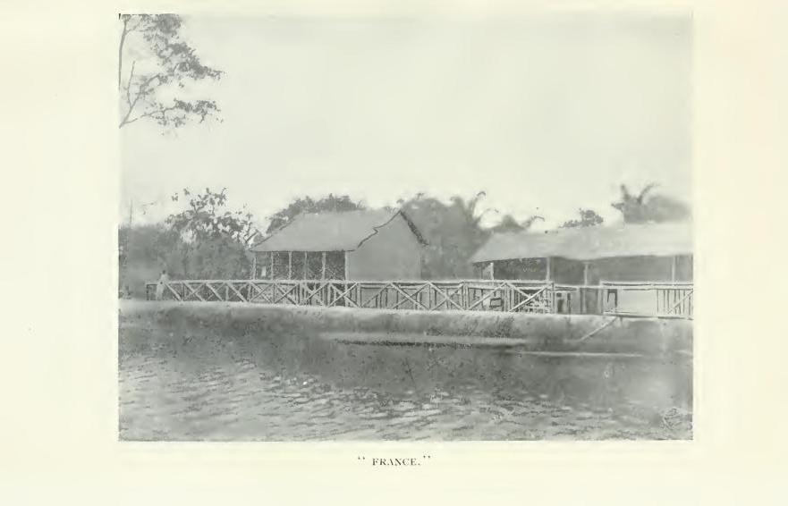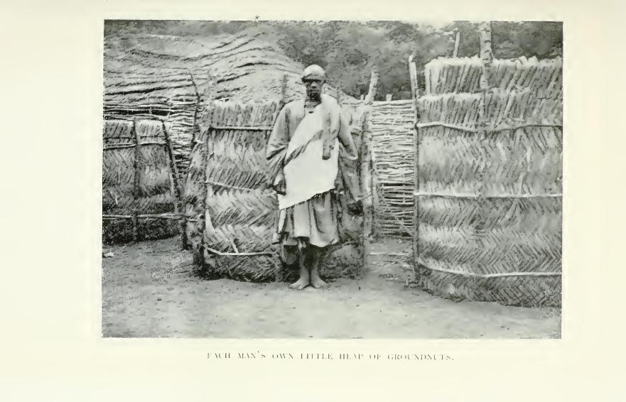 In the breaks in the mangrove, Balanghar is one of them, there is, of course, a little hard earth—the great shady ficus elasticus, beautiful silk-cotton trees, and cocoa-nut palms grow; the traders' yards have white stone posts at the four corners marking the extent of their leaseholds, and in these enclosures are the trading-houses, the round huts of the native helpers, and the little crinted yards, in which are poured the groundnuts, which are the occasion of all this clatter.