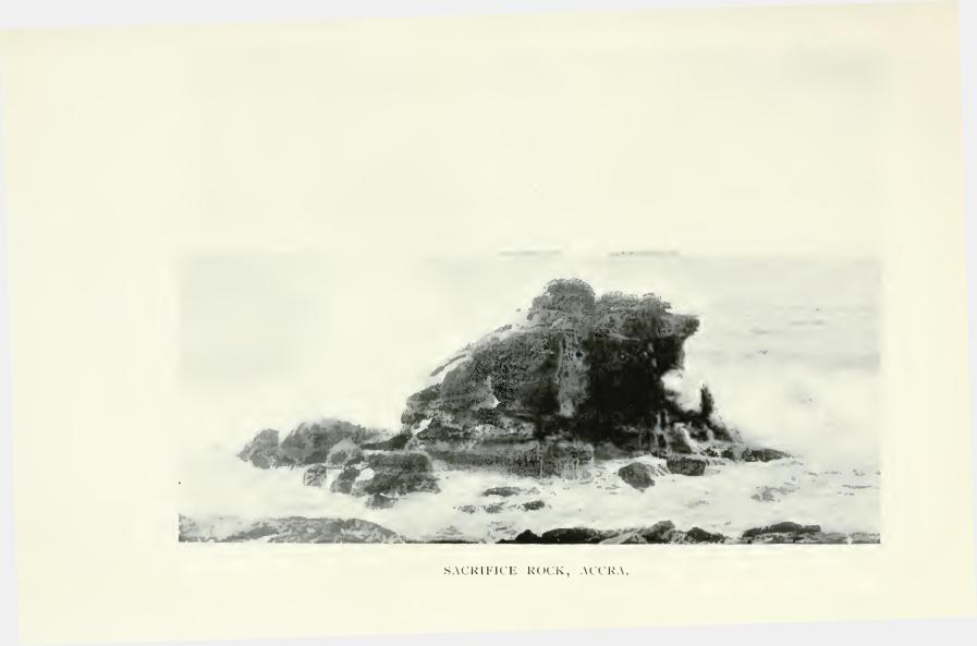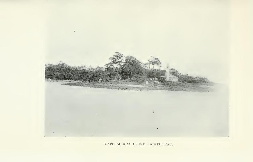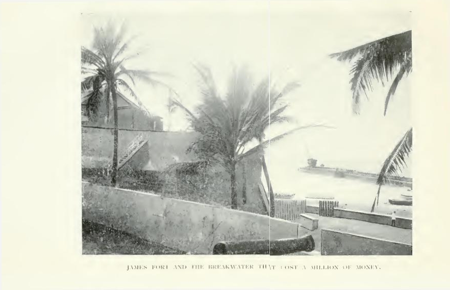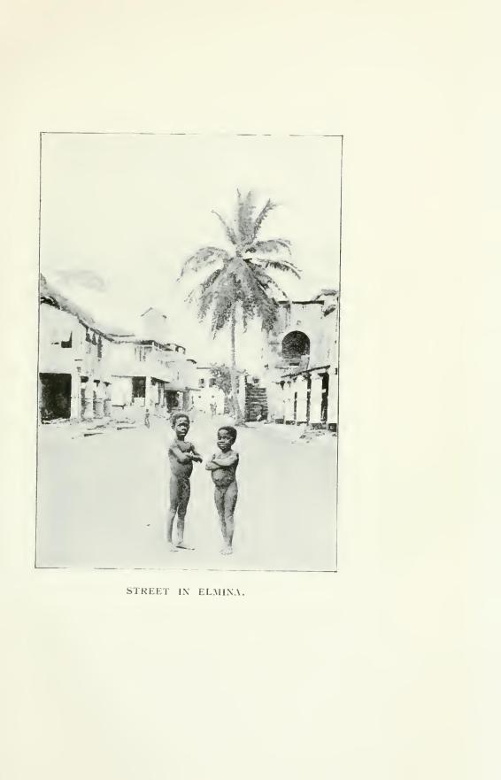 For the first seventeen miles the little ship, towing her lighters behind and alongside, went up a river that was like a sea, so far away were the mangrove swamps that are on either side. Then we reached Fort St James, and the river narrows. Very pathetic are the ruins of Fort St James. No one lives there now; no one has lived there for many a long day, but you see as you pass and look at the crumbling stones of the old fort why West Africa gained in the minds of men so evil a reputation. The place is but a rocky islet, with but a few scanty trees upon it; above is the brazen sky, below the baked earth, on which the tropical sun pours down with all the added heat gathered from the glare of the river. They must have died shut up in Fort St James in those far-away days. Tradition, too, says that the gentlemen of the company of soldiers who were stationed there were for ever fighting duels, and that the many vacancies in the ranks were not always due to the climate. But the heat and the monotony would conduce to irritability, and when a hasty word had to be upheld at the sword's point, it is no wonder if they cursed the Coast with a bitterness that is only given to the land of regrets. But all honour to those dead-and-gone Englishmen. They upheld the might of Britain, and her rights in the trade in palm oil and slaves and ivory that even then came down the river. And if they died—now, now at last, after many weary years, their descendants are beginning dimly to realise, as they never did, the value of the land for which they gave their lives.