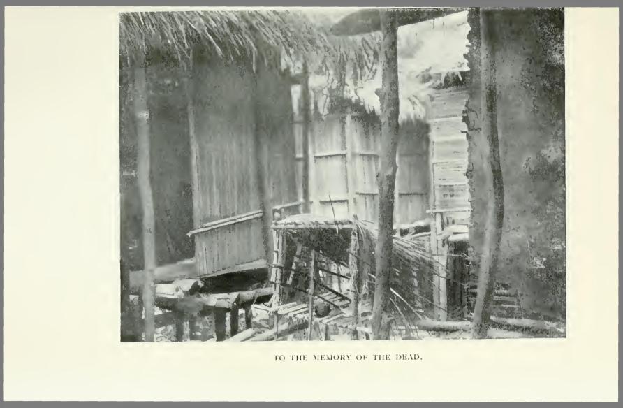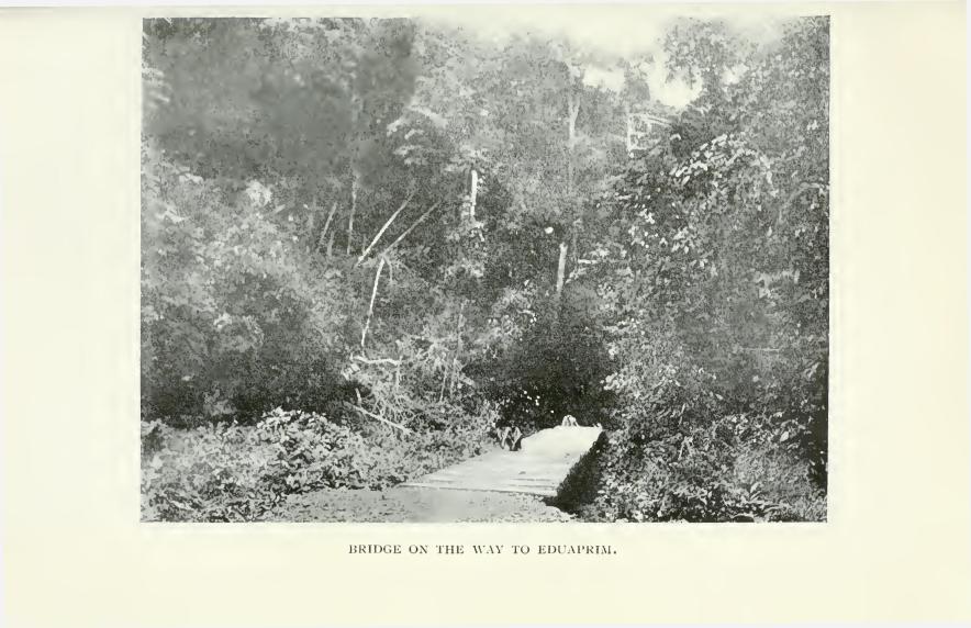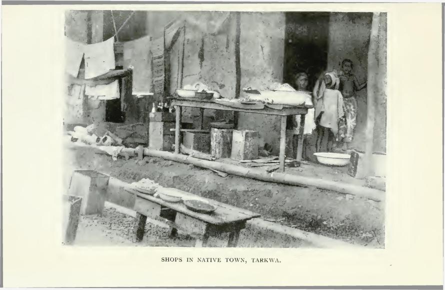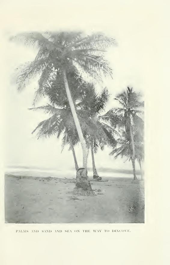 It would be impossible to describe in detail all the little wharves at which we stopped; besides, they all bore a strong family resemblance to one another, differing only when they were in the upper or lower river. Long before I could see any signs of human habitation the steamer's skipper was wildly agitated over the mails, wrinkling up his brows and pawing them over with his dirty black hands—mine were dirtier, at least, they showed more, and the way to the deck was so coaly it was impossible to keep clean. Then he would hang on to a string, which resulted in the most heartrending wails from the steamer's siren; a corrugated-iron roof would show up among the surrounding greenery, and a little wharf, or “tenda,” as they call them here, would jut out into the stream. These tendas are frail-looking structures built of the split poles of the rhon palm. There seem to be as many varieties of palm as there are of eucalyptus, all much alike to the uninitiated eye.