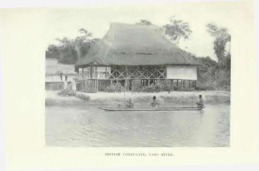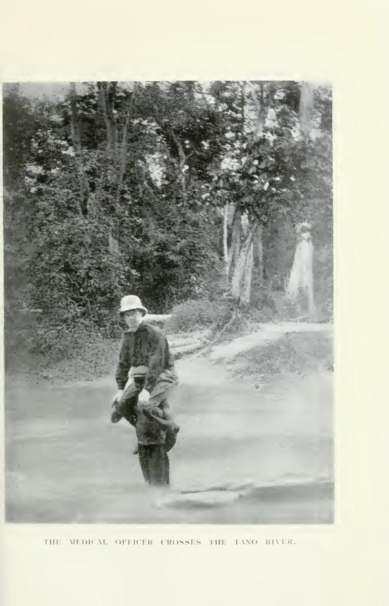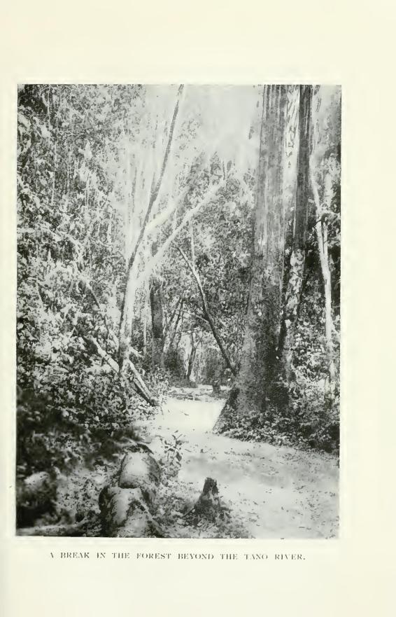 “The trees,” I began; and then he felt I really was silly, for every medical man knows the proper thing is to get rid of the trees, and have some artificial form of shade. At least, that is what I gathered from his subsequent explanation. The idea is apparently to cut down all the forest trees, and when the place is bare, they can be replaced by fresh trees, planted exactly where they ought to grow. Since they are not English trees it does not matter how beautiful they are, and that they take at least two hundred and fifty years to come to perfection is a matter of small moment. So the medical officer and I disagreed, till we came to Tanosu, a little town on the Tano River.