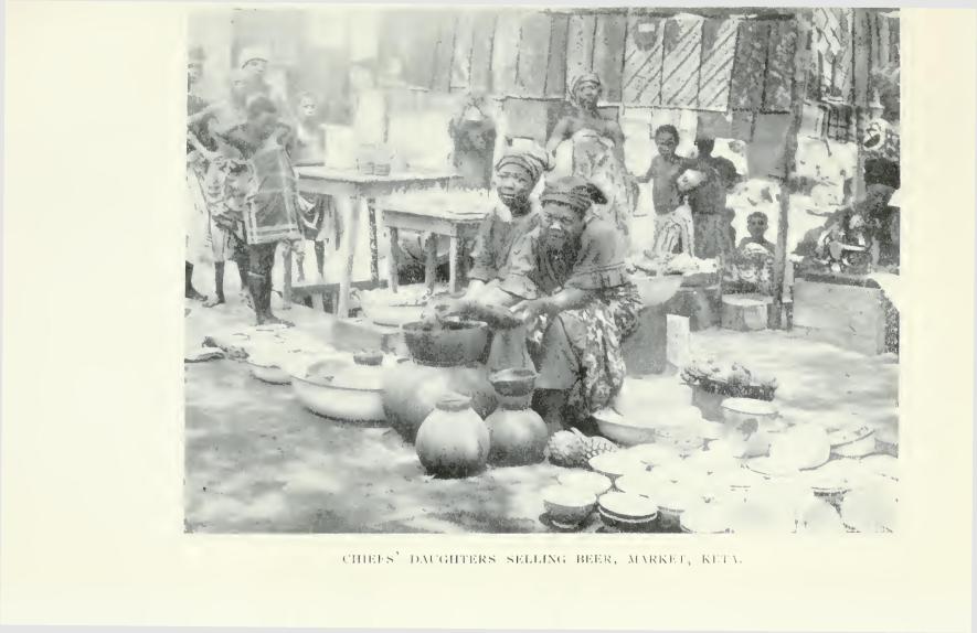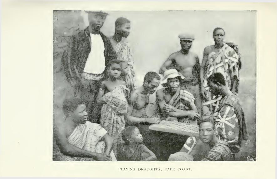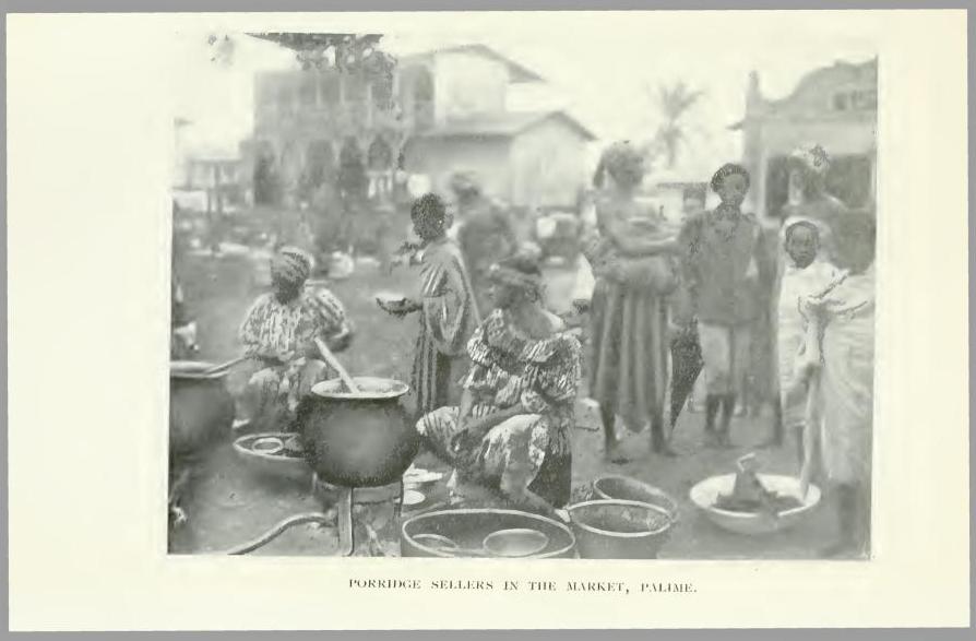 I always made it a practice to rise early in West Africa, because the early morning is the most delightful time, and he who stays in bed till halfpast seven or eight is missing one of the pure delights of life. When I had had my early breakfast, I went to inspect the town. The market lies but a stone's throw from Government House, and here all the natives were to be found, and the white men's servants buying provisions for the day. To me, before I went to Africa, a negro was a negro, and I imagined them all of one race. My mind was speedily disabused of that error. The negro has quite as many nationalities, is quite as distinct as the European. Here in this little colony was a most cosmopolitan gathering, for the south and north meet, and Yorubas from Lagos, Gas from Accra, mongrel Creoles from Sierra Leone meet the Senegalese from the north, the Hausas from away farther east; and the natives themselves are the Mohammedan Jolloff, who is an expert river-man, the Mandingo, and the heathen Jolah, who as yet is low down in the scale of civilisation, and wears but scanty rags. And all these people were to be found in the market in the early morning. It is enclosed with a high wall, the interior is cemented, and gutters made to carry off moisture, and it is all divided into stalls, and really not at all unlike the alfresco markets you may see on Saturdays in the poorer quarters of London. Here they sell meat, most uninviting looking, but few butchers' shops look inviting; fish—very strange denizens come out of the sea in the Gambia; native peppers, red and green; any amount of rice, which is the staple food of the people, and all the tropical fruits, paws-paws, pine-apples, and dark-green Coast oranges, which are very sweet; bananas, yellow and pink, and great bunches of green plantains. They are supposed to sell only on the stalls, for which they pay a small, a very small rental; but, like true natives, they overflow on to the ground, and as you walk you must be careful not to tread on neat little piles of peppers, enamelled iron-ware basins full of native rice, or little heaps of purple kola-nuts—that great sustaining stimulant of Africa.