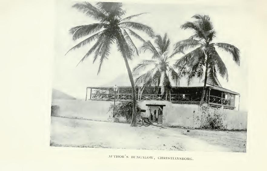 At first I hardly thought about these things. I was absorbed in the wonder of the new life. I stayed at Government House with the Governor, and was caught up in the little whirl of gaieties that greeted his return. The house was tropical, with big, lofty, airy rooms and great wide verandahs that as a rule serve also as passageways to pass from one room to another; for Government House, Bathurst, is built as a tropical house should be—must be—built, if the builder have any regard for the health of its inmates. There were no rooms that the prevailing breeze could not sweep right through. There was a drawingroom and a dining-room on the ground floor, but I do not think either Sir George or I, or his private secretary, ever used the drawing-room unless there were guests to be entertained. The verandahs were so much more inviting, and my bedroom was a delightful place. It ran right across the house. There was no carpet, and, as was only right, only just such furniture as I absolutely needed. The bed was enclosed in another small mosquito-proof room of wirenetting, and it was the only thing I did not like about the house. There, and at that season, perhaps it did not very much matter, for a strong Harmattan wind, the cool wind of the cold, dry season, was blowing, and it kept the air behind the stout wire-netting fresh and clean; but I must here put on record my firm belief that no inconsiderable number of lives in Africa must be lost owing to some doctor's prejudice in favour of mosquito-proof netting. A mosquito-proof netting is very stout indeed, and not only excludes the mosquito, but, and this far more effectually, the fresh air as well. The man who has plenty of fresh air, day and night, will be in better health, and far more likely to resist infection if he does happen to get bitten by a fever-bearing mosquito, than he who must perforce spend at least a third of his time in the vitiated air of a mosquito-proof room. This I did not realise at Government House, Bathurst, or if I did, but dimly, for there in December the strong Harmattan would have forced its way through anything. I spent most of my time on the verandah outside my own room, where I had a view not only of the road that ran to to the centre of the town but right away across the river. Here I had my breakfast and my afternoon tea, and here I did all my writing.