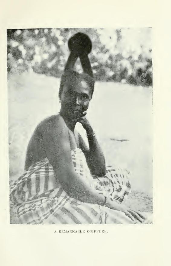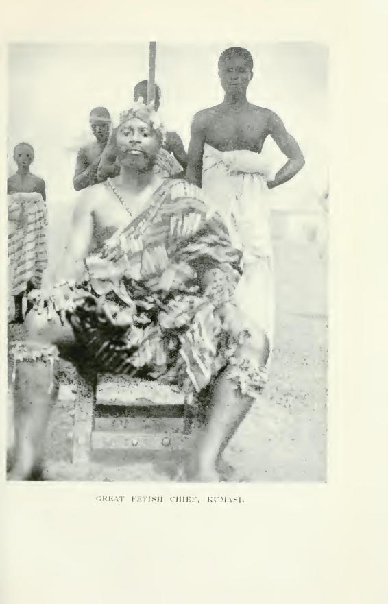 It was well he explained. Long before we could see the town, running along the forest path came the Ashanti warriors to meet me, and they came with yells and shouts, firing off their long Danes, so that presently I could see nothing but grey smoke, and I could hear nothing much either for the yells and shouts, and blowing of horns, and beating of tom-toms. It is just as well to explain an Ashanti welcome, else it is apt to be terrifying, for had I not been told I certainly should never have realised that a lot of guns pointing at me from every conceivable angle and spouting fire and smoke, were emblems of goodwill. But they were; and then I was introduced to the chiefs, and took their photographs. And now I have an awful confession to make. I have taken so many Ashanti chiefs that I do not know t'other from which. They were all clad in the most gorgeous silken robes, woven in the country, in them all the colours of the rainbow, and they were all profusely decorated with golden ornaments. They had great rings like stars and catfish on their fingers, they had all manner of gold ornaments on their heads, round their necks, round their arms, and on their legs, and they had many symbolical staffs with gold heads carried round them. Always, of course, they sat under a great umbrella, and their attendants too wore gold ornaments. Some of the latter were known as their souls, and the Chiefs soul wore on his breast a great plate of gold. What his duties are now I do not know, I think he is King's messenger, but in the old times, which are about ten years back, his duties were more onerous. He was beloved of the Chief, and lived a luxurious life, but he could not survive his Chief. When his master died, his sun was set, and he was either killed or buried alive with him. Moreover, if the Chief had an unpleasant message to a neighbouring chief, he sent his soul to carry it, and if that chief did not like the message, and desired war, he promptly slew the messenger, put his jaw-bone in a cleft stick and sent it back. Altogether the Chiefs soul was by no means sure of a happy life, and on the whole I think must infinitely prefer the pax Britannica.
