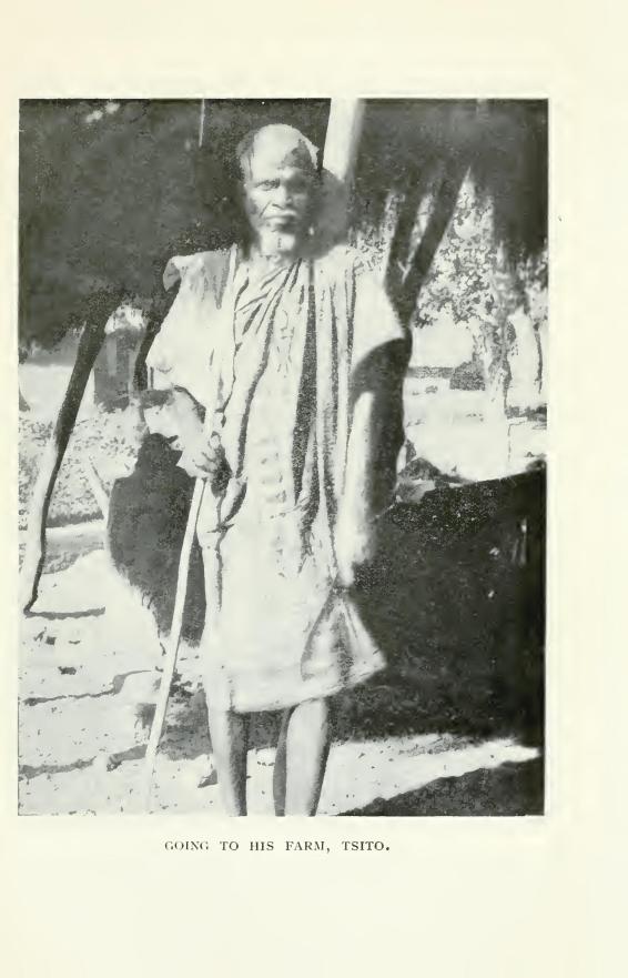 Odumase the white men almost razed to the ground as punishment for the part it took in the great rebellion, but it is fast going up again. Many houses are built, ugly and after the white man's fashion, and many more houses are building. We passed one old man diligently making swish, that is kneading earth and water into sort of rough bricks for the walls, and I promptly took a photograph of him, for it seemed to me rather remarkable to see him working when all the rest of the place was looking at the white woman. And then I saw an old woman with shaven head and no ornaments whatever; she was thin and worn, and I was sorry for her. “No one cares for old women here,” I thought, I believe mistakenly, so I called her over and bestowed on her the munificent dole of threepence. She took my hand in both hers and bowed herself almost to the ground in gratitude or thanks, and I felt that comfortable glow that comes over us when we have done a good action.