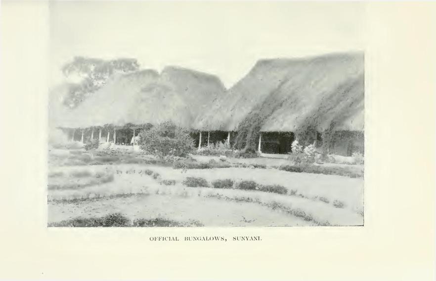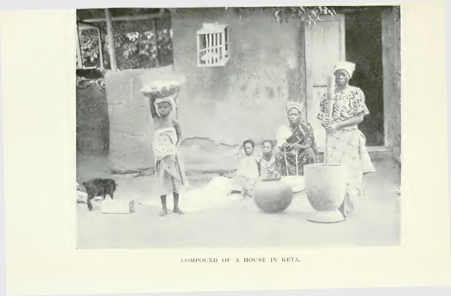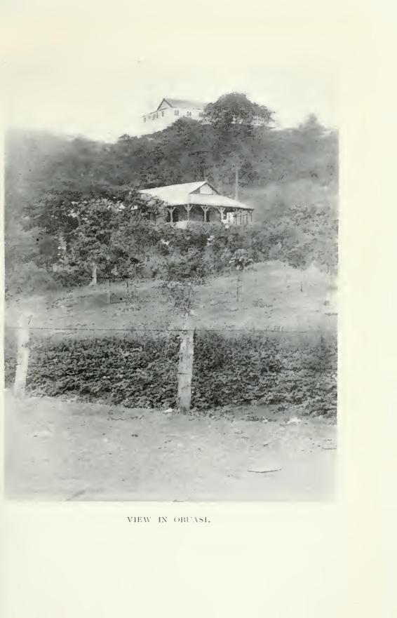 At Sunyani there are usually six white men, namely a Provincial Commissioner, a medical officer—the relief had come up with me—three soldiermen, and a non-commissioned officer, and I think my sympathies are rather with that colour sergeant. The other men are all of one class, but he must be utterly alone. The houses and the men were equally delightful. I was taken into a mud-built house with a thatched roof, large and spacious. There were, of course, only holes for windows and doors, and the floors were of beaten earth, but it was most wonderfully comfortable and homelike. The Commissioner was a great gardener, my room was a bower of roses, and there were books, the newest books and magazines, everywhere. I should like to have stayed a month at Sunyani. Think of it! everything had to be carried eighty miles on men's heads, through a dense forest, across all manner of watercourses, where the white ant refused to allow a bridge to remain more than a fortnight, and yet one felt in the midst of civilisation. They told me I was brave to come there, but where was the hardship? none, none. It was all delightful. But there was another side. Close to the European bungalows was a little fort to which the men might retire in case of danger. They did not seem to think that they would ever be likely to require it, but there it was, and I, who had seen the old-time forts along the Coast, looked at this one with interest. It had a ditch round it, and walls of mud, and these were further strengthened by pointed stakes, bound together with barbed wire. An unpleasant place for a naked man to rush would be the little fort at Sunyani. Close against its wall so as to shelter the office, and yet outside so as not to embarrass the people, is the post and telegraph office, and so fast is civilisation coming to that outpost, that they take there for stamps, telegrams, and postal orders something like fourteen pounds a week.