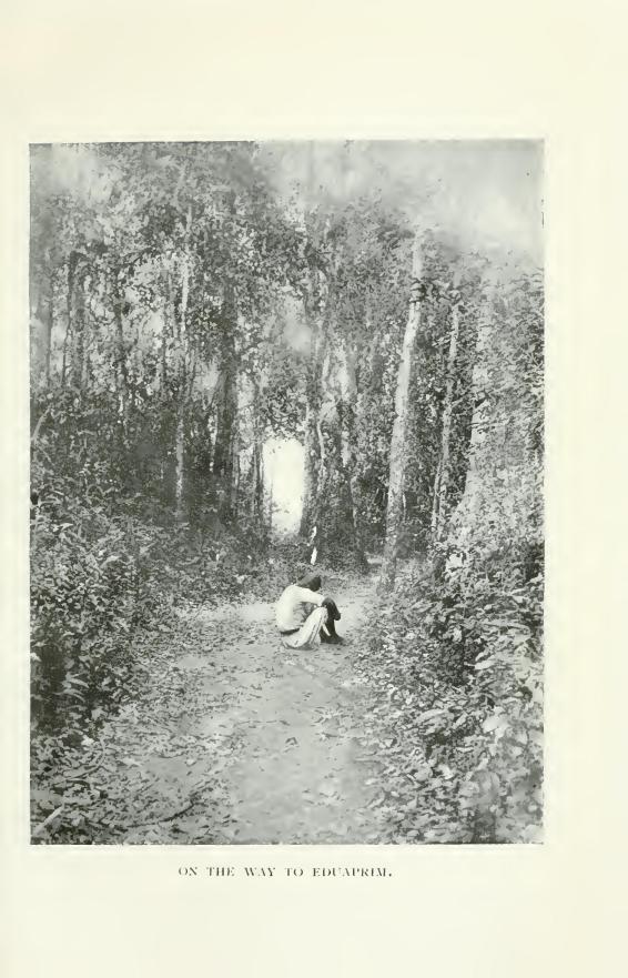 Before dinner I think the whole of the women of that village had been to see me, and had eaten up the very last of my biscuits, but I did not mind, for was it not the end of the journey, and they were so interested, and so smiling, and so nice. We had dinner, and we burned up the last of the whisky to make a flare over the plum-pudding; and then the medical officer wished me good night and wended his way to his house somewhere in the town, Grant and the cook betook themselves to another hut nearer the town and barricaded the door, and then suddenly I realised that I was entirely alone on the edge of this vast, mysterious, unexplainable forest. And the headman had said “the bush no be fit.” I ought to have remembered Anum Mount and Potsikrom, but I didn't. I crept into bed and once more gave myself up to the most unreasoning terror. What I expected to come out of that forest I do not know. What I should have done had anything come I'm sure I do not know, but never again do I want to spend such a night. The patter of the rain on the iron roof made me shiver, the sighing of the wind in the branches sent fingers clutching at my heart; when I dropped into a doze I waked in deadly terror, my hands and face were clammy with sweat, and I dozed and waked, and dozed and waked, till, when the dawn came breaking through the clouds at last, it seemed as if the night had stretched itself into an interminable length. And yet nothing had happened; there had been nothing to be afraid of, not even a leopard had cried, but so tired was I with my own terrors that I slept in my hammock most of the way into Kumasi.