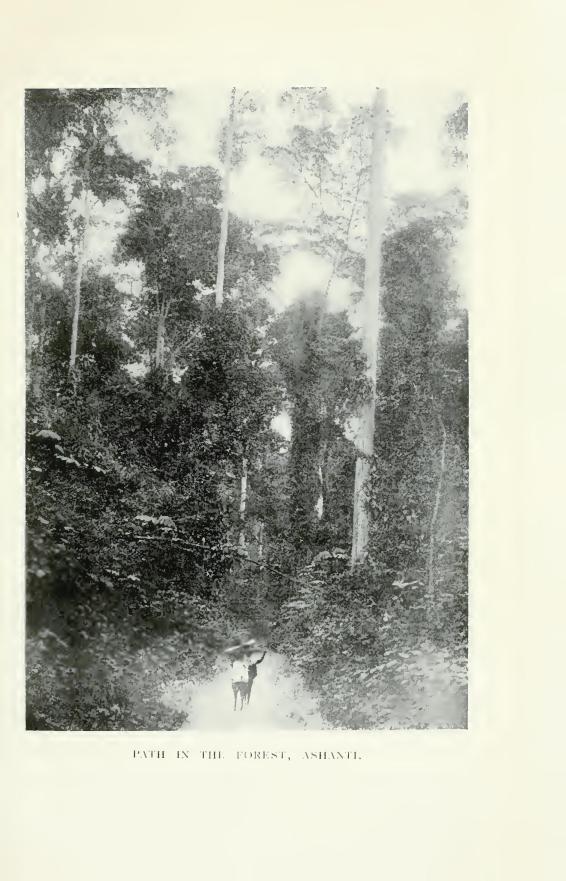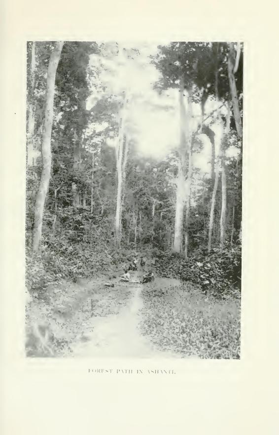 The forest was getting denser and denser. There were fewer towns and clearings on this day—nothing but the great trees and the narrow ribbon of road with the strip of blue sky far, far away. It was very awe-inspiring, the forest. I should have been unspeakably terrified to pass through it alone, but my chattering men took away all sense of loneliness. There was not much to see, but yet the eternal trees had a most wonderful charm. It was like being in some lofty cathedral where the very air was pulsating with the thought of great and unseen things beyond the comprehension of the puny mortals who dared rashly to venture within the precincts. No wonder the Ashanti gave human sacrifices. Sacrifice, we all know, is the basis of all faith, and what lesser thing than a man could be offered in so great a sanctuary?