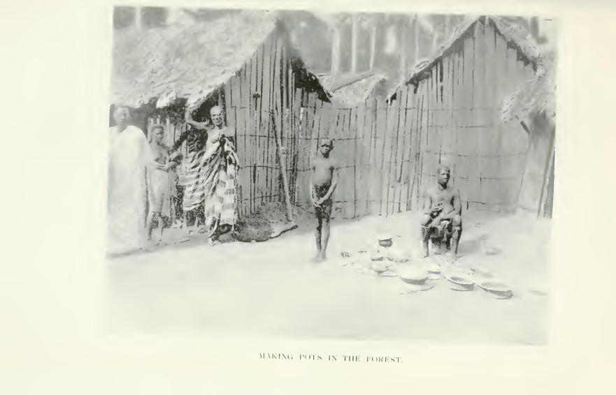 We were in the heart of the forest now. There were but one or two villages and only one or two places that could be dignified by the name of clearings. At one, as big, perhaps, as a tiny London square, three or four huts had been erected, and an old woman was making pots. They were all set out in the sun to dry, and the good lady was very nervous when I wanted to take her photograph. She consented at last, and sat there shivering, in her hand a great snail shell which she used to ornament the pots. They were such a lonely little company, so cut off from all their kind, and we must have been such wondrous figures breaking in on their life and then passing on again. I gave them the last bright new pennies I had, and left them wondering.