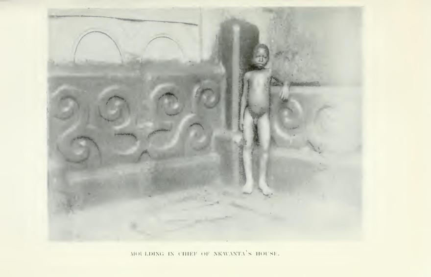 We put in a long day that day, and in the full heat of the noontide arrived at Nkwanta, a most important place, whose Chief rules over a large tract of country. We came upon the butchers' stalls first, all kept by Hausas or Wangaras. This country, on account of the tsetse fly, will allow but few cattle to live, and these men from the north drive them down, kill them, and sell them, for the Ashantis are rich, and like to buy meat. I had hardly taken a photograph of these stalls, when from all sides I saw the people assembling, and presently the Chief appeared. He brought offerings, a sheep, fowls, eggs; yams, and plantains; but this time I pointed out that I was on a journey, and could not take the presents, as I had no means of carrying them. He was very anxious indeed we should stay for that night; said he, they were celebrating the Coronation, and there would be a big dance. I went into his house and took a photograph of the moulded clay that ornaments the walls, and a small slave-boy was proud to stand in the corner so as to give life to the picture, and I think Nkwanta was sorry we elected to go on. I was a little sorry myself afterwards, for as we passed along the forest path we met sub-chiefs going in to the Coronation ceremonies, men carried high in their hammock-chairs, followed by a motley assemblage of men and women, bearing long Danes, horns, drums, household utensils, and all the paraphernalia of a barbaric chief.