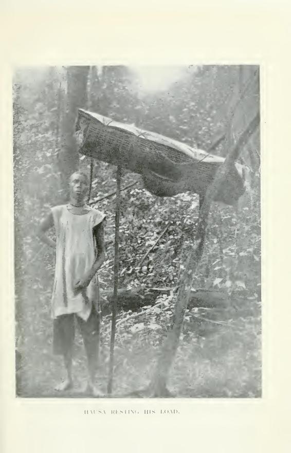 Sunyani is one of the great halting places for the Hausas and Wangaras who come down from Wenchi, so on the French border and here I was introduced into great compounds, where the men who bring down cattle and horses and other goods from the north take up their abode, and rest before they start on their wearisome journey through the forest to Kumasi. I had come through in five days, but these men generally take very much longer. The Hausa carries tremendously heavy loads, so heavy that he cannot by himself lift it to his head, and therefore he always carries a forked stick, and resting his load on this, rests it also in the fork of a tree, and so slips out from underneath it. Again and again on our way up had we come across men thus resting their heavy loads. He must walk warily too, for they say so heavy is the load that the Hausa who stubs his toe breaks his neck. Slowly he goes, for time as yet is of no consequence in West Africa. A certain sum he expects to make, and whether he takes three months or six months to make it is as yet a matter of small moment to the black man, apparently, whatever his race.
