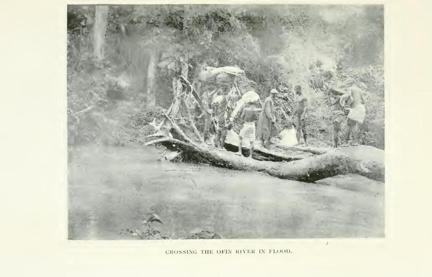 The rainy season was upon us, and it was time for me to go back. The medical officer, who had just been relieved, was coming down with me, and this medical officer was very sick with a poisoned hand. It was my last trek in the bush, and I should have liked to linger, but the thought of that bad hand made me go faster, for I would not keep him from help longer than I could help. So we retraced our steps exactly, doing in four days what I had taken five to do on the way up, and this was the more remarkable because now it rained. It rained heavens hard, and the little streams that our men had carried us through quite easily on the way up, were now great, rushing rivers that sometimes we negotiated with a canoe, and sometimes laboriously got over with the aid of a log. It really is no joke crossing a flooded African stream on a slimy log. I took a picture of one, with the patient Wangara crossing. Then my men carried me in my hammock to the log, and with some little difficulty I got out of that hammock on to it. I had to scramble to my feet, and the man beside me made me understand that I had better not fall over, as on the other side the water was deep enough to drown me. I walked very gingerly, because the water beneath looked unpleasantly muddy, up that tree-trunk, scrambled somehow round the root and down the other branch, till at last I got into water shallow enough to allow of my being transferred to my hammock and carried to dry land, there to sit and watch my goods and chattels coming across the same way. I felt a wretch too, for it had taken close on twenty men, more or less, to get me across without injury, and yet here were a company of Wangaras or Hausas, and the patient women had loads on their heads and babies on their backs. No one worried about them.