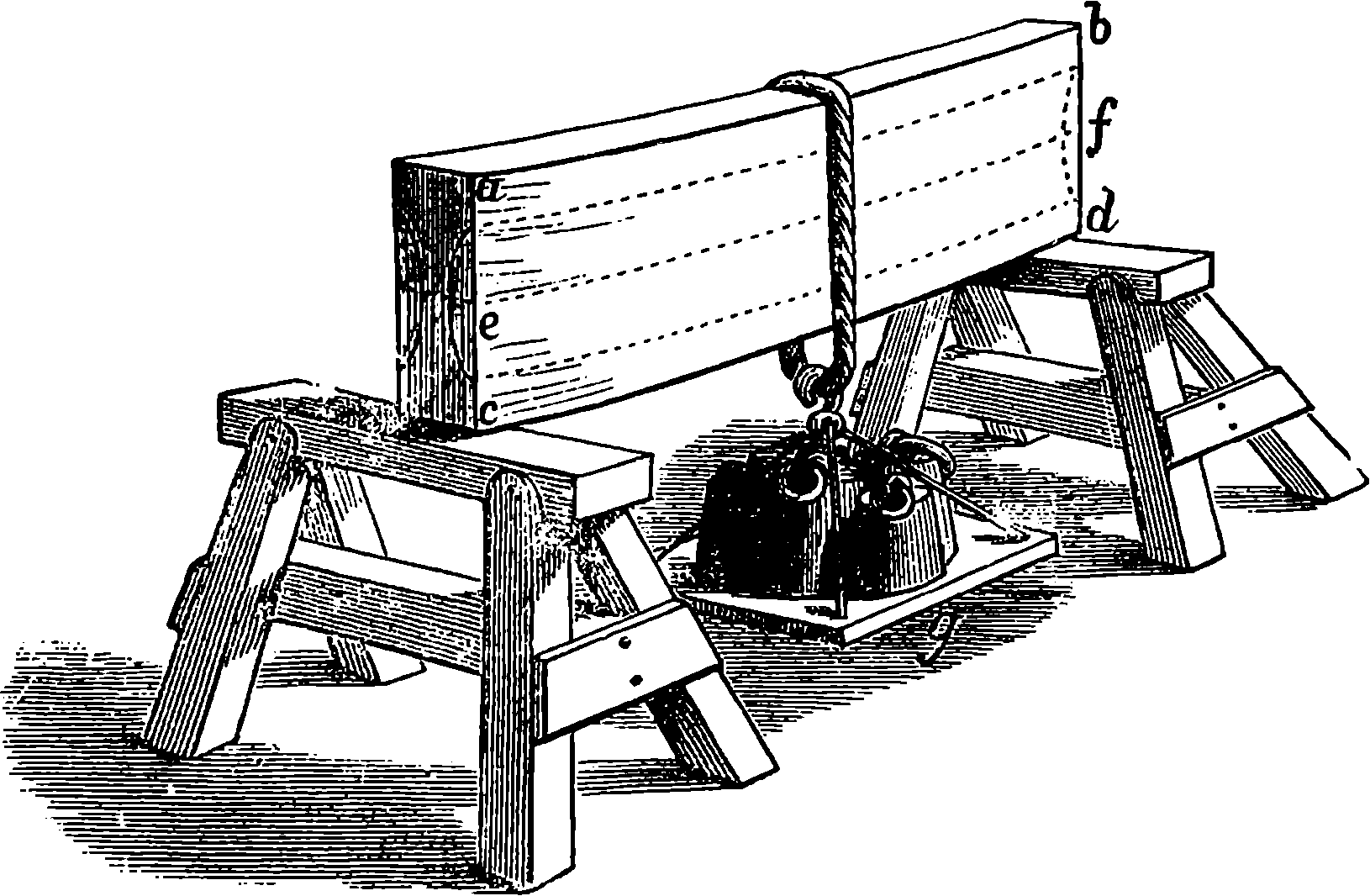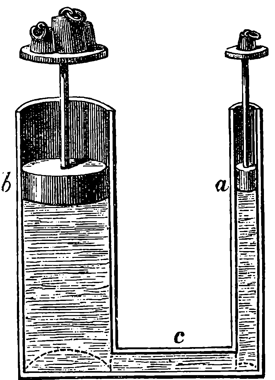 The statement here should have been more explicit, as it has reference to a state of things not to be realised in practice. Like the well-known “first law of motion,” it can neither be demonstrated à priori, nor proved by any direct and simple experiment. The first law of motion asserts that a body in motion, not acted on by any external force, will continue to move in a straight line, and with a uniform velocity. Now we cannot place a body in such a position that it will not be acted upon by some external forces; but the more we lessen the effect of external forces, the more nearly is the motion straight and uniform. Similarly in the case supposed, the intention is to show that the weight carried up is in a position to do just as much work as was done upon it. We must suppose several impracticable but conceivable conditions in order to eliminate considerations which do not concern the theoretical question; we must suppose the cord to be weightless and absolutely devoid of rigidity; the pulley to have no mass or inertia, that is to require no force to set it in motion, and to move without any friction; the air to offer no resistance; and the force of gravity to be uniform throughout the space. Some approximation to these conditions is practicable, as, for example, the pulley might be the lightest possible, and turn on friction wheels, the cord might be the finest silk thread, and so on. But it is not the influence of these external forces we are considering, but only the energy due to the position of the raised weight. Assuming, therefore, the disturbing conditions absolutely eliminated, it is not difficult to see that no downward force or pressure, however small, could be applied for ever so short a time, to the upper weight without setting the system in motion. The motion would be an accelerated one so long as the force was applied, it would become uniform when the force ceased to act; it would have a velocity proportionate to the force. In any case, after a time the descending weight would reach the ground, and for our point of view it is quite immaterial whether the time occupied by the movement were 5 minutes or 5,000 years, for be it observed, time does not enter into the definition of work as it does into that of “horse-power.” Then by pushing the conceived conditions to their limits, we may see that without considering any question of conversion of motion into heat, the raised weight can, in theory at least, give back again the energy spent upon it.