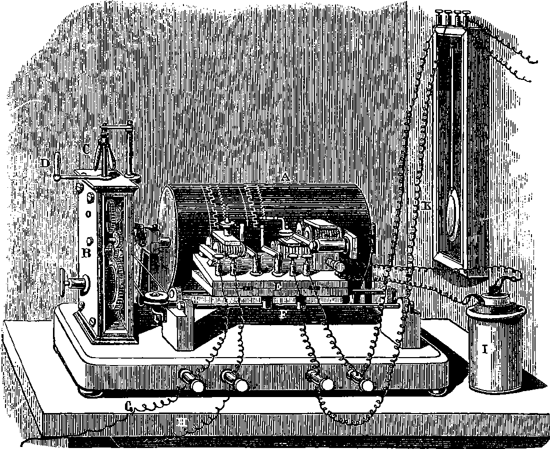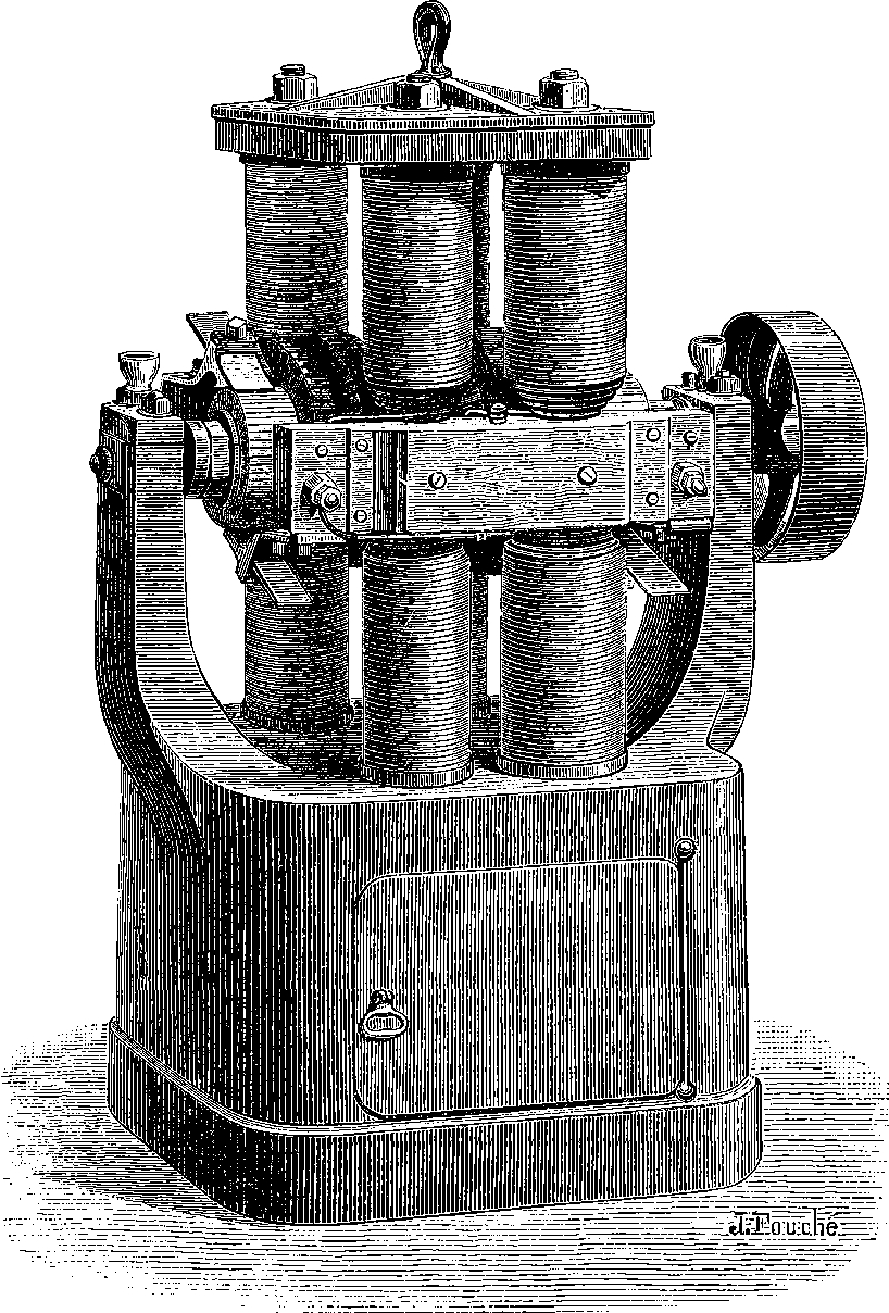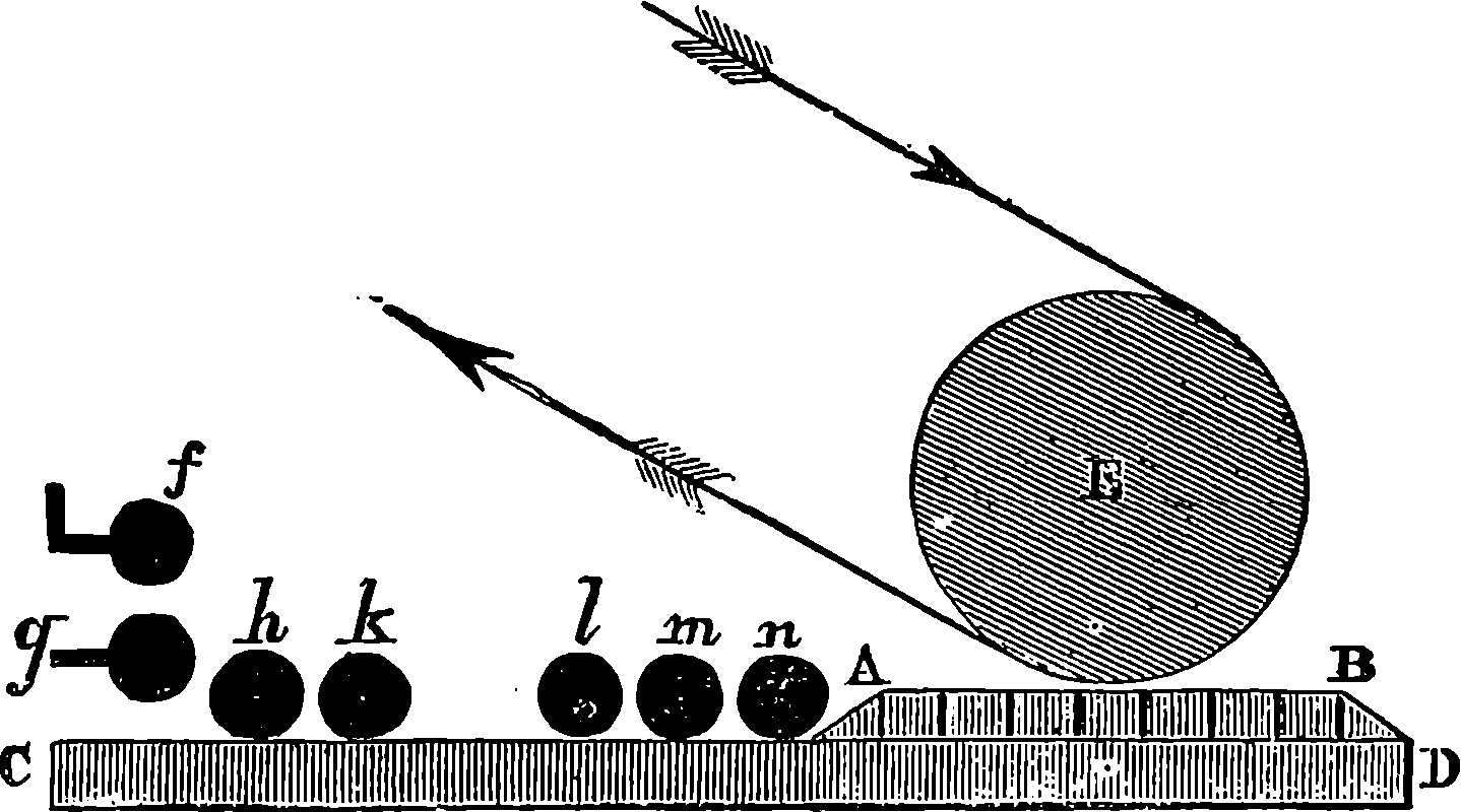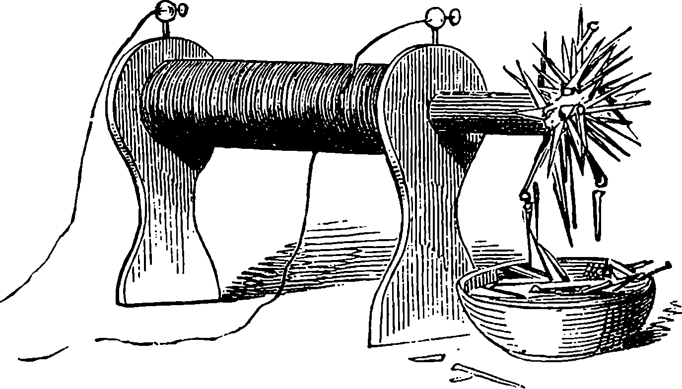 Perhaps the first step should be to point out the fact of the various forces of nature—mechanical action, heat, light, electricity, magnetism, chemical action—being so related that any one can be made to produce all the rest directly or indirectly. Some examples of the conversion of one form of force into another occur in the foregoing pages. Thus, on page 485 an experiment is described in which electricity produces a mechanical action; electricity is also shown, on page 496, to produce heat; on page 491 chemical action; on page 501 magnetism. Then, as instances of the inverse actions, there is on page 488, in the first paragraph on “Electric Induction,” an account of the mode in which mechanical movements may give rise to electricity; and in the experiments in pages 508, 509, and particularly in the account of the Gramme machine, page 511, it is shown how mechanical movements can, through magnetism, produce electricity. The voltaic element, page 491, and the galvanic batteries, are instances of chemical action supplying electricity. On page 518 a striking instance is mentioned of changes in the forms of force. Every lighted candle is a case of chemical action giving rise to light; and interesting examples of the inverse relation are referred to on page 608. On page 168 is represented the conversion of arrested motion into heat and light. We have, indeed, sufficient examples to arrange a series of these conversions of forces in a circle. Thus, chemical action (oxidation in the animal system) supplies muscular power, this sets in motion a Gramme machine, the motion is converted into electricity, the electricity produces the electric light, and light causes chemical action, and with this the cycle is complete. In the steam engine heat is converted into mechanical force, and many cases will present 804themselves to the reader’s mind in which mechanical actions give rise to heat. The doctrine of a mutual dependence and convertibility among all the forms of force was first definitively taught in England by Mr. (now Justice) Grove, in 1842; and almost simultaneously Dr. Meyer promulgated similar views in Germany. Mr. Grove subsequently embodied his doctrine in a treatise, called “The Correlation of the Physical Forces,” which has seen several editions.