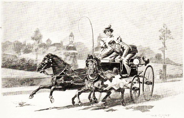 As he spoke he dropped one rein, threw all his weight on the other, and at the same instant brought the whip down with a stinging cut on the right-hand side of the off horse. The frenzied animal instinctively sprang to the left, both yielded to the heavy tug of that rein, and the team was turned into the side street. The cart slewed across the smooth asphalt, lunged perilously to one side, came within a hair's-breadth of upsetting, and then righted. Two seconds later the mad fright of the ponies was checked by pure exhaustion half-way up the steep hill-side. There they stood panting and trembling, while a crowd of excited spectators gathered about them with offers of assistance and advice.