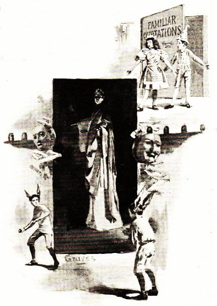 Preface.—A dress of white muslin or paper cambric. A small muslin apron entirely covered, except the hem, with printed words. A white ribbon, with "Preface" in black capitals, extending from the right shoulder diagonally to the waist, where it ends under a bow of red ribbon. On the right shoulder a red bow. The flowing hair is crowned by a dainty muslin cap trimmed with a knot of red ribbon.