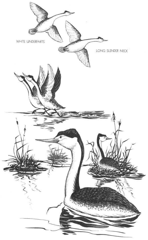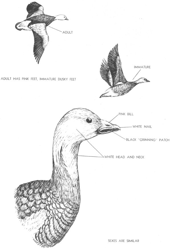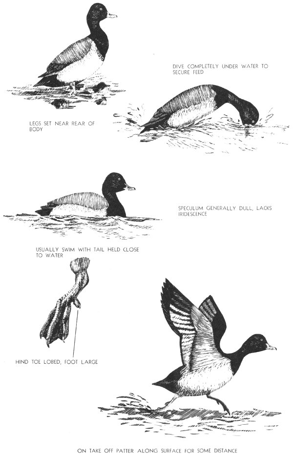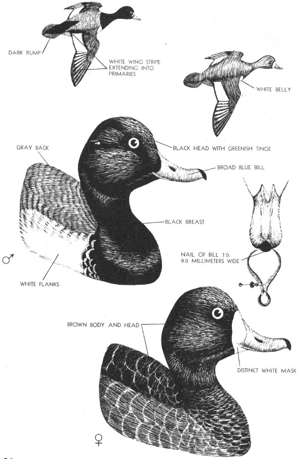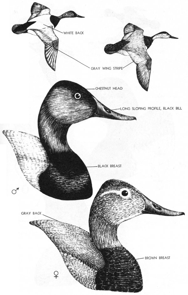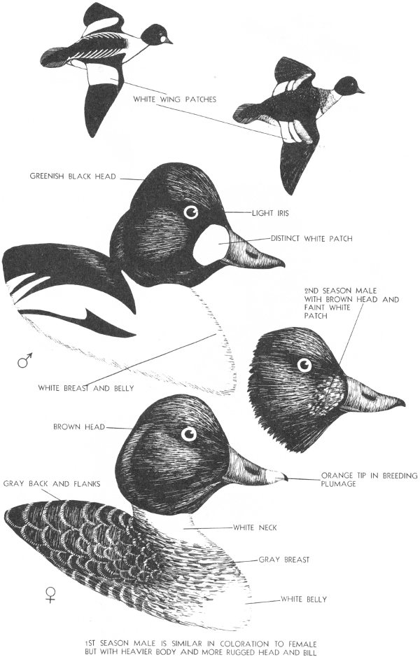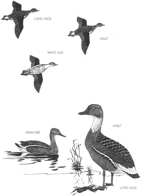 Identification of birds in the field, and particularly on the wing, as ducks and geese are usually seen over decoys, is easier than appears at first try. The trick is to note, in addition to shape and approximate size, the general arrangement of light and dark areas in the plumage, for nearly every species has its own distinctive pattern. With practice, the eye can be trained to pick out this pattern at a glance, and within a short time recognition becomes automatic. The illustrations which follow, one for each important species of Central Flyway waterfowl, make use of this practice of “pattern recognition” in the two or more flying birds at the top of the page. Actually in many cases recognition by flight pattern and flight characteristics will soon become evident.