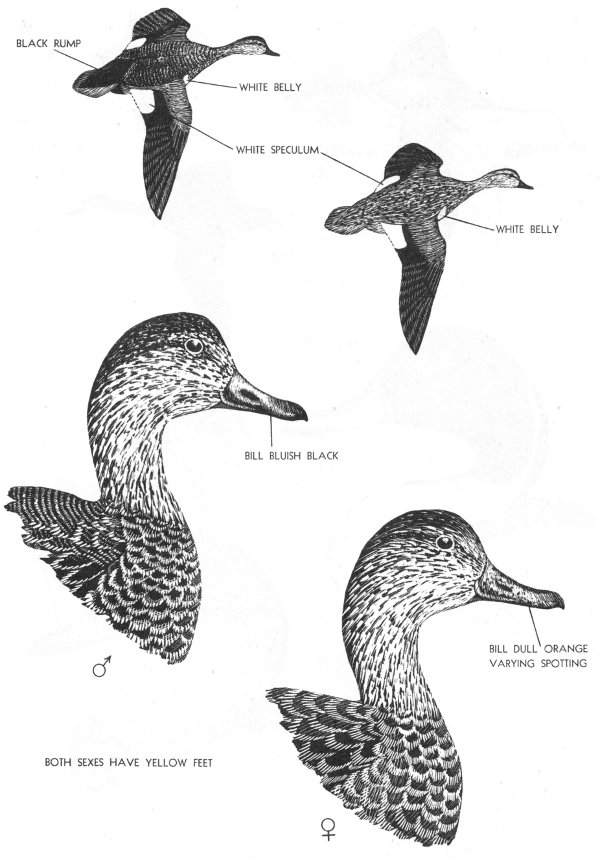 In each drawing of ducks the flying female leads, with the drake following, for this is the usual order in a mated pair during winter, and spring. On the lower part of each page are shown enlarged heads, adult male on the left, female on the right, with an immature head added when the difference is substantial, or with certain details which further aid identification when the bird is in hand. All ducks, both flying pairs and heads, are drawn in direct proportion to each other, but geese, because of their larger size, are reduced one third from the duck proportion.