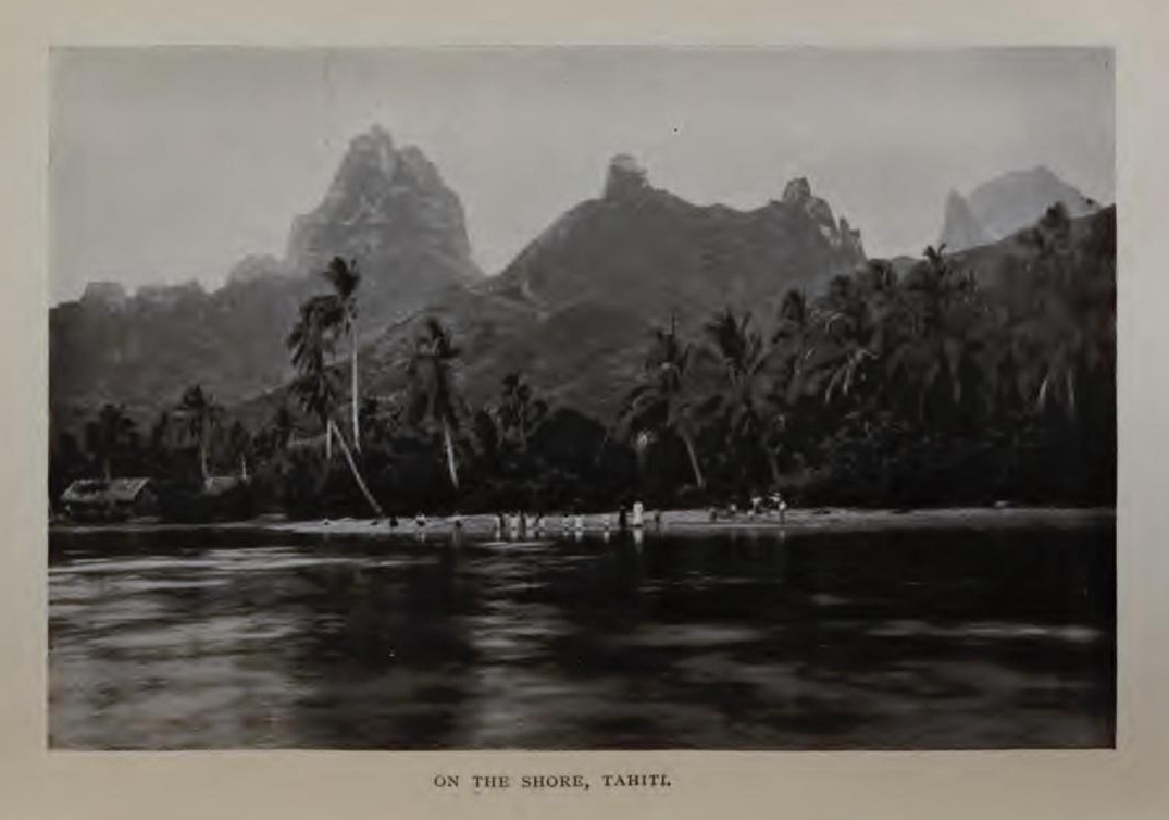 A duty, obvious, immediate, and unperformed, is perhaps the best of all spices to a dish of sweet laziness. And there is not on earth’s round ball such a spot to be lazy in as pleasant Papeëte. One is never fairly awake. It is dreamland—and what a happy dream! The golden light on the still lagoon is surely the “fight that never was on sea nor land”—before we sailed in under the purple peaks of Orohena. The chanting of the coral reef far out at sea, unceasing, day and night, is the song the sirens sang to strong Ulysses, in the dream dreamed for all ages by the old Greek poet, long ago. The languorous voices of the island women, sweet and low as the “wind of the western sea”—the stillness of the island houses, where feet go bare upon the soundless floors, and music waxes and wanes so softly now and then in whispering songs or lightly swept piano keys, that it only blends with the long mysterious murmur of the wind in the rustling palm trees, to lull the senses into perfect rest—these, too, are of the world of dream.