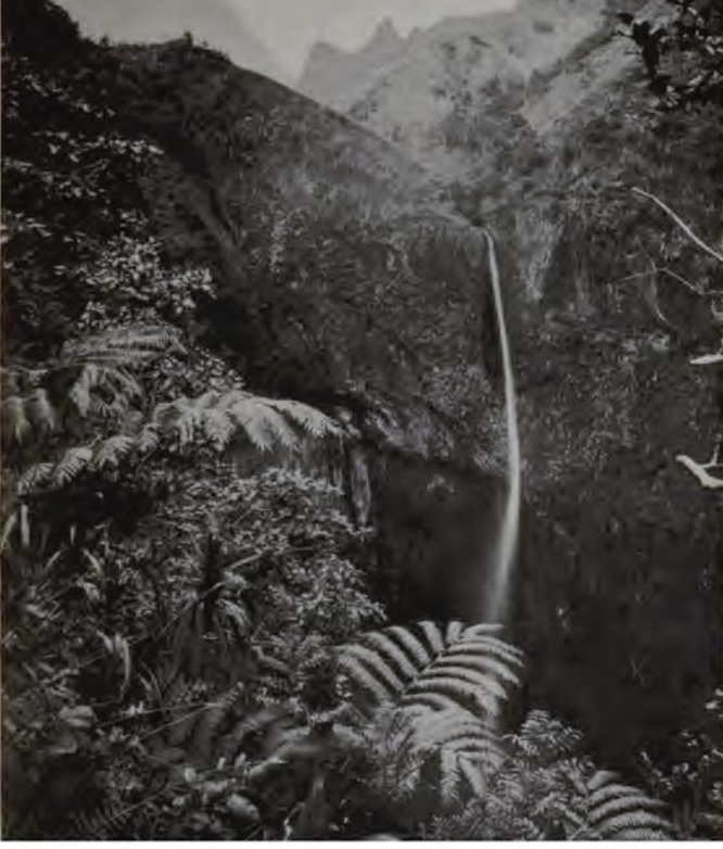 Imagine a deep gorge in the heart of green, heavily-wooded hills; at the bottom, a narrow channel shaded by overhanging trees, where the pure mountain water runs clear and cold and deep, amber-brown pools quiver at the foot of white plunging falls—one only some seven feet high, the other a good thirty. This last was the Sliding Rock, over which we were all going to fling ourselves à la Sappho by-and-by, only with less melancholy consequences. It looked formidable enough, and when Pangati and the others, with cries of delight, pulled off their dresses, wound white and pink and green cotton lava-lavas over one shoulder, and round from waist to knee, crowned themselves picturesquely with woven fern-leaves, and plunged shrieking over the fall, I began to wish I had not come, or coming, had not promised to “slide.” However, there was no help for it, so I got into my English bathing-dress, which excited peals of merry laughter, because of its “continuations,” waded down the stream, and sitting in the rush of the water, held tightly on to a rock at each side, and looked over my own toes at the foaming, roaring thirty feet drop.