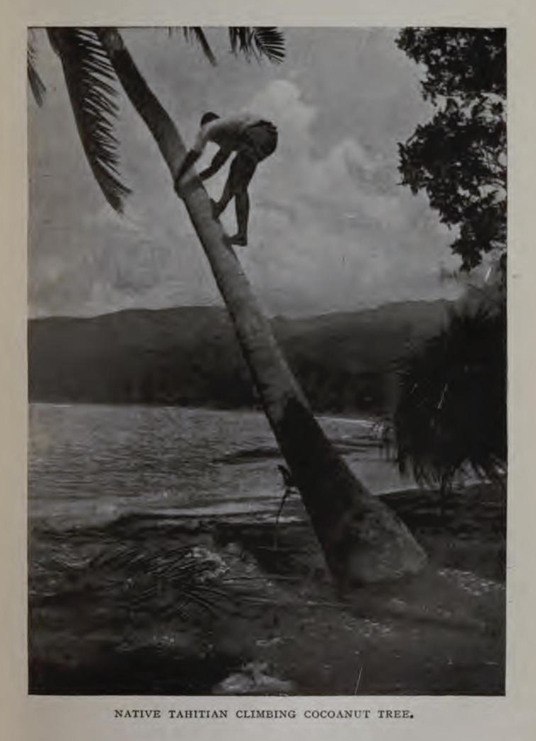 A native slipped silently from among the thick trees beside us—a bronze-skinned youth of eighteen or nineteen, dressed only in a light pareo or kilt of blue and white cotton. He stood with hands lightly crossed on his breast, looking at us with the expression of infinite kindliness and good-nature that is so characteristic of the Tahitian race. We signed to him that we wanted to drink, and he smiled comprehendingly, shook his head at the nuts on the ground, and lightly sprang on to the bole of the palm beside us, which slanted a little towards the sea. Up the trunk of that tree, which inclined so slightly that one would not have thought a squirrel could have kept its footing there, walked our native friend, holding on with his feet and hands, and going as easily as a sailor on a Jacob’s ladder. Arrived in the crown some seventy feet above, he threw down two or three nuts, and then descended and husked them for us.
