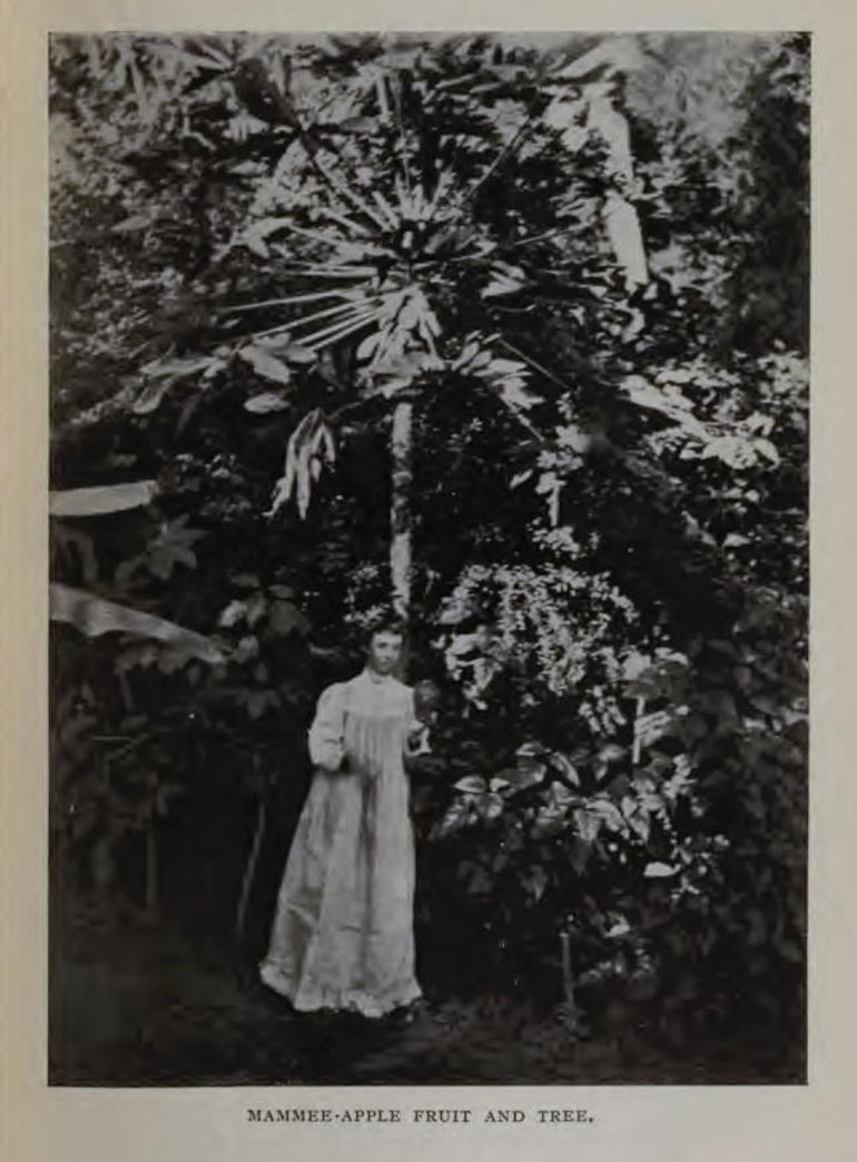 Then the fruit! bananas as big as cucumbers, as small as ladies’ fingers (after which, indeed, this little sugar-sweet, variety is named), dark red bananas, flavoured like a peach, large bloomy ones, tasting and looking like custard within; smooth yellow ones, like those exported to other countries, whither the daintier fruits will not safely go—pineapple in rough-skinned heaps (one learns soon in Tahiti how to eat a pineapple, and that is to peel it, cut it into largest possible lumps, eat the latter undiminished even if they make you speechless, and never, never, shoe the fruit)—oranges of several different kinds, custard-apples, rose-apples, paw-paws, melons, avocado pears, guavas, mangoes, and other fruits the name of which I have never heard—all lying together in masses under the lamplight, costing not as many halfpence to buy as at home they would cost shillings.