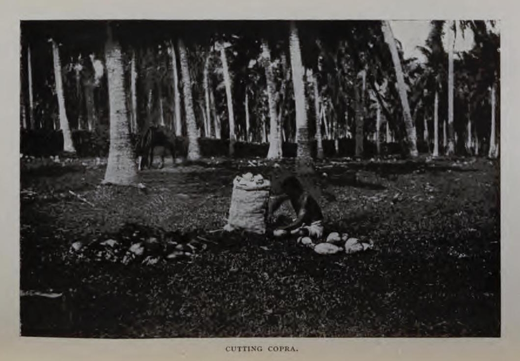 Husking a cocoanut is one of the simplest-looking operations in the world, but I have not yet seen the white man who could do it effectively, though every native is apparently born with the trick. A stick is sharply pointed at both ends, and one end is firmly set in the ground. The nut is now taken in the hands, and struck with a hitting and tearing movement combined, on the point of the stick, so as to split the thick, intensely tough covering of dense coir fibre that protects the nut, and rip the latter out. It comes forth white as ivory, about the same shape and size as the brown old nuts that come by ship to England, but much younger and more brittle, for only the smallest of the old nuts, which are not wanted in the islands for copra-making, are generally exported. A large knife is used to crack the top of the nut all round, like an egg-shell, and the drink is ready, a draught of pure water, slightly sweet and just a little aerated, if the nut has been plucked at the right stage. There is no pleasanter or more refreshing draught in the world, and it has not the least likeness to the “milk” contained in the cocoanuts of commerce. No native would drink old nuts such as the latter, for fear of illness, as they are considered both unpleasant and unwholesome. Only half-grown nuts are used for drinking, and even these will sometimes hold a couple of pints of liquid. The water of the young cocoanut is food and drink in one, having much nourishing matter held in solution. On many a long day of hot and weary travel, during the years that followed, I had cause to bless the refreshing and restoring powers of heaven’s best gift to man in the tropics, the never-failing cocoanut.
