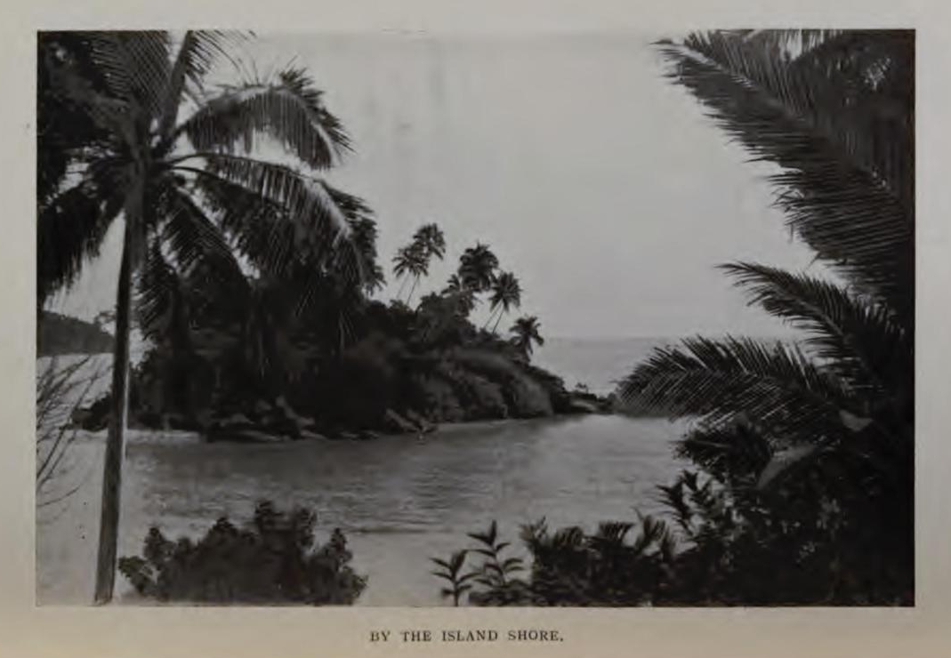 Something out of dreamland, also, is the little hotel where most of the travellers stay—a rambling bungalow in a grass enclosure, overrun with vivid flowers and splendid leafage. That the proprietress should welcome her guests in a long lace and muslin nightgown-dress, her pretty brown feet bare, and her flowing wavy hair crowned with a wreath of perfumed gardenia and tuberose, seems quite a natural part of the dream; that the chamber-maids should be beautiful island girls clad in the same garb, and that they should sit in the drawing-room playing the piano and singing wild melancholy island songs, like the sighing of the surf on the shore, when they ought to be making beds or serving dinners, is also “in the picture.” That the Chinese cook should do elaborate Parisian cookery, and that the coffee and the curry and the bread (or at least the bread-fruit) should be picked in the garden as required, and that there should be no visible means of shutting the door of the bathroom, which is very public, until a carpenter is called in, and that L————, the charming proprietress, should explain with a charming smile: “Only the house been using it all this time,” to account completely for the deficiency—all this belongs unmistakably to the irresponsible dream-country. And when the warm tropic night drops down, and one goes wandering in the moonlight, to see for the first time the palm-tree plumes all glassy-silver under the radiant sky, flashing magically as they tremble in the faint night wind, it is more than ever the land of dream that is thus lit up in the soft clear dusk. So vivid is the moonlight, that one can even see the scarlet colour of the flamboyant flowers fallen in the dust, and distinguish the deep violet and hyacinthine hues of the far-off mountain peaks across the bay.... How, in such a place, can one waste the night in sleep?
