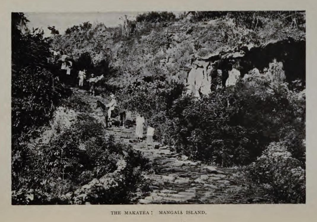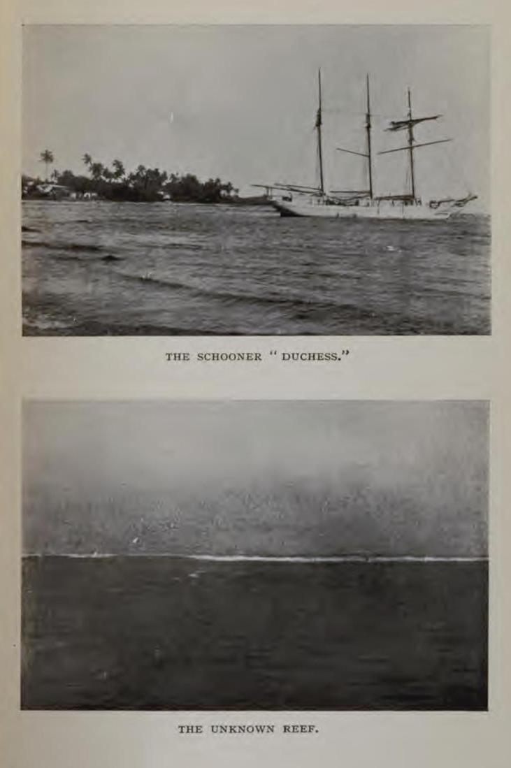 One of the ladies of the party wandered off with me down the beach, neither of us being interested in the resting-place of the defunct Pomare—and here we found plenty of food for mind and body both. For was not this a pandanus, or screw-pine, which we had read about, overhanging the lagoon, with the quaintest mops of palmy foliage, set on long broom-handles of boughs, and great fruits like pineapples hanging among the leaves, and yellow and scarlet kernels lying thick on the sand below—the tree itself perched up on tall bare wooden stilts formed by the roots, and looking more like something from a comic scene in a pantomime, than a real live piece of vegetation growing on an actual shore? And were not these cocoanuts that lay all about the beach under the leaning palms—nuts such as we had never seen before, big as a horse’s head, and smooth green as to outside, but nuts all the same?
