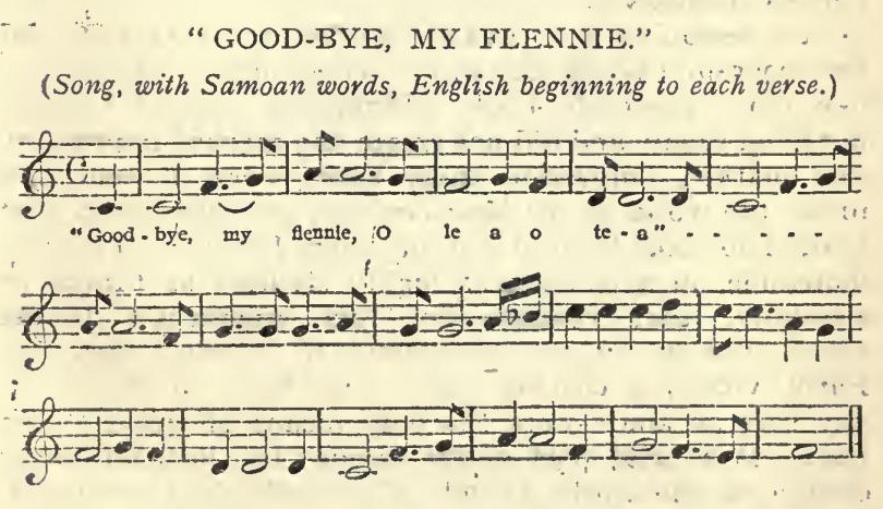 It is Fangati’s turn to dance now, and out she trips, wearing a valuable mat of the finest plait, her pretty wreath, countless scarlet necklaces, and a modest girdle of coloured silk. Fangati has the prettiest foot and hand in Apia, and she is a dainty little dancer—not so marvellously agile and spirited as Fuamoa, and with much less of “devil” in her composition, but a pretty and a pleasant creature to watch. She has reached the twenties, and gone nearly half-way through them, so that she is in a fair way to become an old maid, according to Samoan ideas; but she still retains her maiden state, and declares she will not marry, in spite of good offers from several chiefs. It is said in Apia that she is proud, and wishes to marry a white man—which is much as if a charming English country girl should determine to mate with nothing less than a duke. Country lasses do marry dukes, but not often; and there is not much more chance of my “flennie’s” attaining her ambition, unless Providence is very kind.