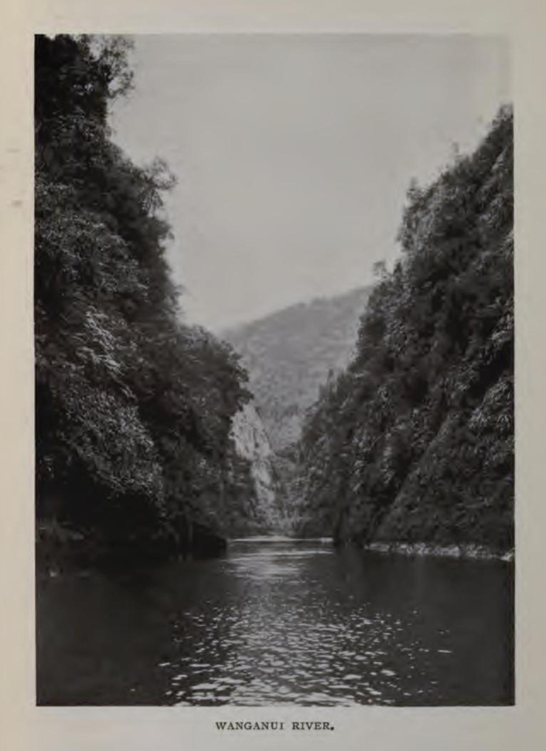 But first, after the railway town and railway hotel were left behind, came Wanganui River, a whole day of it; nearly sixty miles of exquisite loveliness, viewed in perfect comfort from the canopied deck of a river steamer. The Wanganui has been called New Zealand’s Rhine, but it no more resembles the Rhine than it resembles a garden-party or an ostrich farm. It has nothing whatever in common with Germany’s great historic river but its beauty; and the beauty of the Wanganui is of an order very far indeed removed from that of the ancient castle-crowned streams of Europe, which are strewn with records of dead and decaying æons of human life. Solitude, stillness, absolute, deathly loneliness are the keynotes of Wanganui scenery. Shut in by fold on fold of great green mountain peaks, scarp on scarp of fern-wreathed precipice, one can almost fancy that the swift little paddle-steamer is churning her way for the first time into solitudes never seen of man. Now and then a Maori dug-out canoe, long and thin and upturned at the ends, may be sighted riding under the willows, or gliding down-stream to the swift paddle-strokes of its dusky-faced occupant. At rare intervals, too, the spell of silent lonelinesses broken by the sight of some tiny river-side settlement perched on a great green height—half a dozen wooden houses, and a tin-roofed church; the whole being labelled, with some extraordinarily pretentious name. One of our passengers that day got in at London, and went on to Jerusalem; another was booked from Nazareth to Athens!