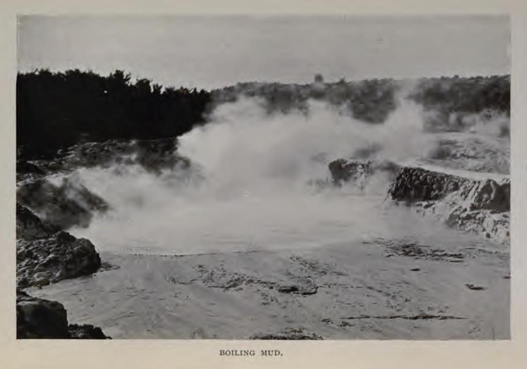 The Valley of Tikitere, some ten miles from Rotorua, is the greatest contrast that could possibly be conceived to Hamurana’s enchanted loveliness. Enchanted indeed this valley also plight be, but by a spell of evil. It is the nearest possible approach to the familiar conception of hell. A stretch of white siliceous soil, streaked here and there with the blood-coloured stains of hematite, or the livid yellow of sulphur, is pitted all over with lakes, pools, and small deep pot-holes of boiling mud, sometimes thick, sometimes thin, but always scalding, bubbling, spirting, and threatening. Chief of all the horrors is the well-named lake, “Gates of Hell.” Standing upon a bank of white earth that is warm underfoot, and seamed with steaming cracks, one looks down upon a ghastly hellhole of a seething cauldron, slimy black in colour, and veiled with stinging mists that only now and then lift sufficiently to show the hideous surface of the lake. The foul broth of which it is composed bubbles and lifts ceaselessly, now and then rising into ominous heights and waves that seem about to break upon the banks above. The heat reaches our faces, as we stand half-stifled on the pathway. Just beside us, a large pool of bubbling mud, which stands constantly at 2120 Fahrenheit—ordinary boiling point—seems almost cool in comparison. Little wonder that is so; for the “Gates of Hell” is largely composed of sulphuric acid, and its surface temperature is 232°.