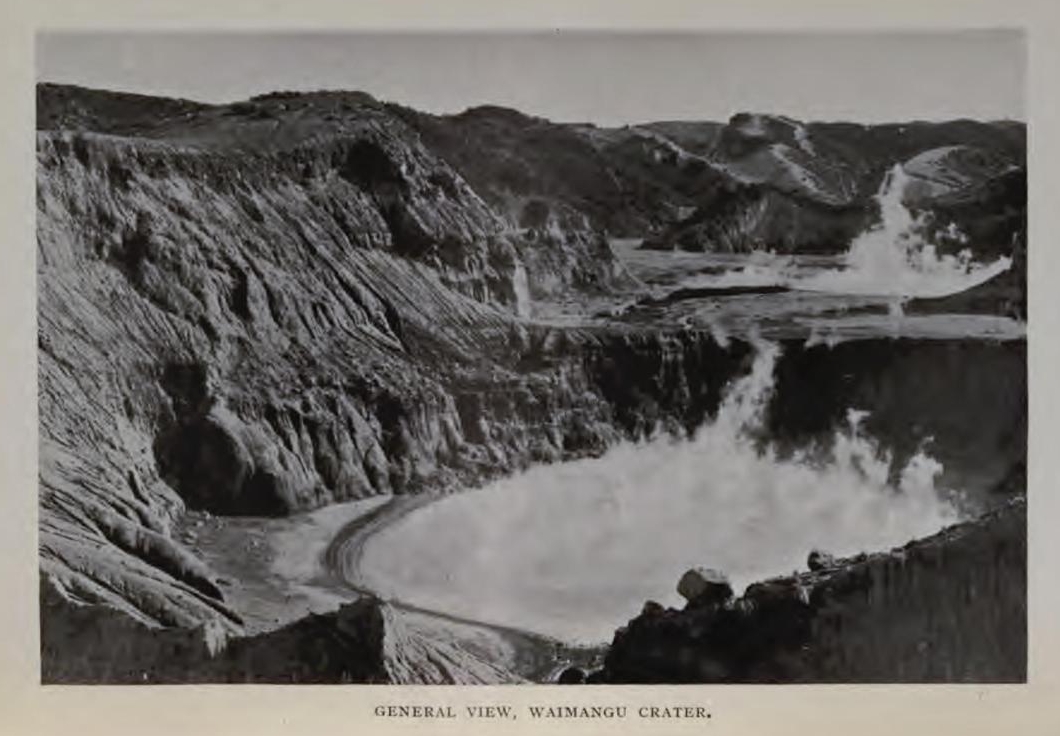 In the summer of 1903 two girls and a guide were killed during the explosion of the geyser. The girls had been repeatedly warned, even entreated, not to stand near the crater, as it was momentarily expected to “play”; but they hovered close by the verge, anxious to secure a photograph. Without warning, Waimangu suddenly rose and hurled itself bodily skyward out of its bed. The enormous backfall of the boiling water caught and swept away the luckless three, and they were carried down the outflow valley in the flood that succeeds every eruption. When found, the bodies were terribly mutilated, and stripped of all clothing. The mother of the girls, standing higher up, saw the whole awful disaster, and had to be forcibly held back from rushing into the crater, in a wild effort to save her children. Since that melancholy day, the geyser basin has been railed off, in such a manner that no one can approach near enough to incur the slightest danger. Warbrick, the head guide of the district, was present, and nearly lost his life in a daring attempt to save the girls and the guide, who was his own brother. He rushed into the midst of the falling stones and water, to try and drag the luckless victims back, but was too late to save them, and narrowly escaped being carried away himself.