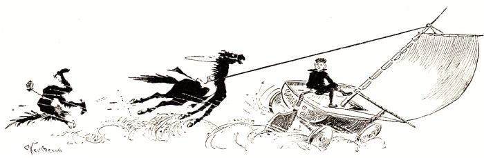 But it was too late. Down the trail behind us thundered the cattle. The bull gave a bellow, and started down into the draw. Taken off our guard, Otto and I were dragged helplessly after him, while Barney, giving an Ogallalla war-whoop, fired his revolver as rapidly as he could. The air fairly quivered with Otto's expostulations, addressed now to the bull and now to the "verfluchte kid." On we swept[Pg 423] in a mad race, and yielding to a wild impulse, I gave forth my most blood-curdling yells. I saw, rather than heard, the startled oaths of the teamsters. In the next moment their horses were plunging and kicking as they heard the roar of the angry Durham charging down upon them. There was a snapping of harness and a breaking of axles as the teams swerved sharply apart, and the new court-house rolled majestically over on its side with a crash of broken windows. On we dashed, a tangle of horses and men, in the wake of the bull, with a score of crazy cattle bringing up our rear. Before the cowboys could recover from their surprise we were upon them. With a snort of defiance the bull toppled over every horse he could reach, and ploughed his way through the crowd of squealing broncos, dragging us after him. As the horsemen scattered I saw Arkansaw Joe rolling out of a cactus-bed, while his bronco fled in the direction of Alkali.
