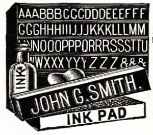 For printing cards, marking linen, books, etc. Contains everything shown in cut. Type, Tweezers, Holder, Indelible Ink, Ink Pad, etc. Thoroughly practical for business or household use and a most instructive amusement. Sent with catalogue illustrating over 1000 Tricks and Novelties, for 10c. in stamps to pay postage and packing on outfit and catalogue. Same outfit with figures 15c. Large outfit for printing two lines 25c.
