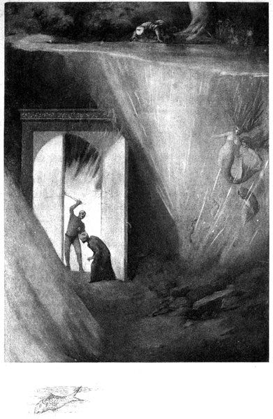 She said, It hath reached me, O auspicious King, that Sindbad the Seaman continued:—When they left me in the cavern with my dead wife and, closing the mouth of the pit, went their ways, I looked about me and found myself in a vast cave full of dead bodies, that exhaled a fulsome and loathsome smell and the air was heavy with the groans of the dying. Thereupon I fell to blaming myself for what I had done, saying, “By Allah, I deserve all that hath befallen me and all that shall befal me! What curse was upon me to take a wife in this city? There is no Majesty and there is no Might save in Allah, the Glorious, the Great! As often as I say, I have escaped from one calamity, I fall into a worse. By Allah, this is an abominable death to die! Would Heaven I had died a decent death and been washed and shrouded like a man and a Moslem. Would I had been drowned at sea or perished in the mountains! It were better than to die this miserable death!” And on such wise I kept blaming my own folly and greed of gain in that black hole, knowing not night from day; and I ceased not to ban the Foul Fiend and to bless the Almighty Friend. Then I threw myself down on the bones of the dead and lay there, imploring Allah’s help and in the violence of my despair, invoking death which came not to me, till the fire of hunger burned my stomach and thirst set my throat aflame when I sat up and feeling for the bread, ate a morsel and upon it swallowed a mouthful of water. After this, the worst night I ever knew, I arose, and exploring the cavern, found that it extended a long way with hollows in its sides; and its floor was strewn with dead bodies and rotten bones, that had lain there from olden time. So I made myself a place in a cavity of the cavern, afar from the corpses lately thrown down and there slept. I abode thus a long while, till my provision was like to give out; and yet I ate not save once every day or second day; nor did I drink more than an occasional draught, for fear my victual should fail me before my death; and I said to myself, “Eat little and drink little; belike the Lord shall vouchsafe deliverance to thee!” One day, as I sat thus, pondering my case 44and bethinking me how I should do, when my bread and water should be exhausted, behold, the stone that covered the opening was suddenly rolled away and the light streamed down upon me. Quoth I, “I wonder what is the matter: haply they have brought another corpse.” Then I espied folk standing about the mouth of the pit, who presently let down a dead man and a live woman, weeping and bemoaning herself, and with her an ampler supply of bread and water than usual.[50] I saw her and she was a beautiful woman; but she saw me not; and they closed up the opening and went away. Then I took the leg-bone of a dead man and, going up to the woman, smote her on the crown of the head; and she cried one cry and fell down in a swoon. I smote her a second and a third time, till she was dead, when I laid hands on her bread and water and found on her great plenty of ornaments and rich apparel, necklaces, jewels and gold trinkets;[51] for it was their custom to bury women in all their finery. I carried the vivers to my sleeping place in the cavern-side and ate and drank of them sparingly, no more than sufficed to keep the life in me, lest the provaunt come speedily to an end and I perish of hunger and thirst. Yet did I never wholly lose hope in Almighty Allah. I abode thus a great while, killing all the live folk they let down into the cavern and taking their provisions of meat and drink; till one day, as I slept, I was awakened by something scratching and burrowing among the bodies in a corner of the cave and said, “What can this be?” fearing wolves or hyænas. So I sprang up and seizing the leg-bone aforesaid, made for the noise. As soon as the thing was ware of me, it fled from me into the inward of the cavern, and lo! it was a wild beast. However, I followed it to the further end, till I saw afar off a point of light not bigger than a star, now appearing and then disappearing. So I made for it, and as I drew near, it grew larger and brighter, till I was certified that it was a crevice in the rock, leading to the open country; and I said to myself, “There must be some reason for this opening: either it is the mouth of a second pit, such as that by which they let me down, or else it is a natural fissure in the stonery.” So I bethought me awhile and nearing the light, found that it came 45from a breach in the back side of the mountain, which the wild beasts had enlarged by burrowing, that they might enter and devour the dead and freely go to and fro. When I saw this, my spirits revived and hope came back to me and I made sure of life, after having died a death. So I went on, as in a dream, and making shift to scramble through the breach found myself on the slope of a high mountain, overlooking the salt sea and cutting off all access thereto from the island, so that none could come at that part of the beach from the city.[52] I praised my Lord and thanked Him, rejoicing greatly and heartening myself with the prospect of deliverance; then I returned through the crack to the cavern and brought out all the food and water I had saved up and donned some of the dead folk’s clothes over my own; after which I gathered together all the collars and necklaces of pearls and jewels and trinkets of gold and silver set with precious stones and other ornaments and valuables I could find upon the corpses; and, making them into bundles with the grave clothes and raiment of the dead, carried them out to the back of the mountain facing the sea-shore, where I established myself, purposing to wait there till it should please Almighty Allah to send me relief by means of some passing ship. I visited the cavern daily and as often as I found folk buried alive there, I killed them all indifferently, men and women, and took their victual and valuables and transported them