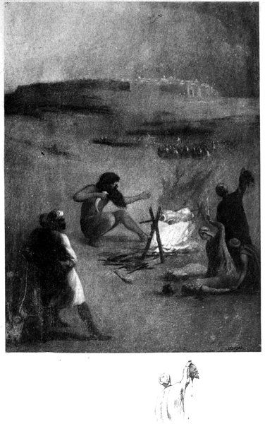 She said, It hath reached me, O auspicious King, that Sindbad the Seaman continued:—When we saw this frightful giant we were struck with exceeding terror and horror. And after trampling upon the earth, he sat awhile on the bench; then he arose and coming to us seized me by the arm choosing me out from among my comrades the merchants. He took me up in his hand and turning me over felt me, as a butcher feeleth a sheep he is about to slaughter, and I but a little mouthful in his hands; but finding me lean and fleshless for stress of toil and trouble and weariness, let me go and took up another, whom in like manner he turned over and felt and let go; nor did he cease to feel and turn over the rest of us, one after another, till he came to the master of the ship. Now he was a sturdy, stout, broad-shouldered wight, fat and in full vigour; so he pleased the giant, who seized him, as a butcher seizeth a beast, and throwing him down, set his foot on his neck and brake it; after which he fetched a long spit and thrusting it up his backside, brought it forth of the crown of his head. Then, lighting a fierce fire, he set over it the spit with the Rais thereon, and turned it over the coals, till the flesh was roasted, when he took the spit off the fire and set it like a Kabáb-stick before him. Then he tare the body, limb from limb, as one jointeth a chicken and, rending the flesh with his nails, fell to eating of it and gnawing the bones, till there was nothing left but some of these, which he threw on one side of the wall. This done, he sat for a while; then he lay down on the stone-bench and fell asleep, snarking and snoring like the gurgling of a lamb or a cow with its throat cut; nor did he awake till morning, when he rose and fared forth and went his ways. As soon as we were certified that he was gone, we began to talk with one another, weeping and bemoaning ourselves for the risk we ran, and saying, “Would Heaven we had been drowned in the sea or that the apes had eaten us! That were better than to be roasted over the coals; by Allah, this is a vile, foul death! But whatso the Lord willeth must come to pass and there is no Majesty and there is no Might, save in Him, the Glorious, the Great! We shall assuredly perish miserably and 26none will know of us; as there is no escape for us from this place.” Then we arose and roamed about the island, hoping that haply we might find a place to hide us in or a means of flight, for indeed death was a light matter to us, provided we were not roasted over the fire[29] and eaten. However, we could find no hiding-place and the evening overtook us; so, of the excess of our terror, we returned to the castle and sat down awhile. Presently, the earth trembled under our feet and the black ogre came up to us and turning us over, felt one after other, till he found a man to his liking, whom he took and served as he had done the captain, killing and roasting and eating him: after which he lay down on the bench[30] and slept all night, snarking and snoring like a beast with its throat cut, till daybreak, when he arose and went out as before. Then we drew together and conversed and said one to other, “By Allah, we had better throw ourselves into the sea and be drowned than die roasted; for this is an abominable death!” Quoth one of us, “Hear ye my words! let us cast about to kill him, and be at peace from the grief of him and rid the Moslems of his barbarity and tyranny.” Then said I, “Hear me, O my brothers; if there is nothing for it but to slay him, let us carry some of this firewood and planks down to the sea-shore and make us a boat wherein, if we succeed in slaughtering him, we may either embark and let the waters carry us whither Allah willeth, or else abide here till some ship pass, when we will take passage in it. If we fail to kill him, we will embark in the boat and put out to sea; and if we be drowned, we shall at least escape being roasted over a kitchen fire with sliced weasands; whilst, if we escape, we escape, and if we be drowned, we die martyrs.” “By Allah,” said they all, “this rede is a right;” and we agreed upon this, and set about carrying it out. So we haled down to the beach the pieces of wood which lay about the bench; and, making a boat, moored it to the strand, after which we stowed therein somewhat of victual and returned to 27the castle. As soon as evening fell the earth trembled under our feet and in came the blackamoor upon us, snarling like a dog about to bite. He came up to us and feeling us and turning us over one by one, took one of us and did with him as he had done before and ate him, after which he lay down on the bench and snored and snorted like thunder. As soon as we were assured that he slept, we arose and taking two iron spits of those standing there, heated them in the fiercest of the fire, till they were red-hot, like burning coals, when we gripped fast hold of them and going up to the giant, as he lay snoring on the bench, thrust them into his eyes and pressed upon them, all of us, with our united might, so that his eyeballs burst and he became stone blind. Thereupon he cried with a great cry, whereat our hearts trembled, and springing up from the bench, he fell a-groping after us, blind-fold. We fled from him right and left and he saw us not, for his sight was altogether blent; but we were in terrible fear of him and made sure we were dead men despairing of escape. Then he found the door, feeling for it with his hands and went out roaring aloud; and behold, the earth shook under us, for the noise of his roaring, and we quaked for fear. As he quitted the castle we followed him and betook ourselves to the place where we had moored our boat, saying to one another, “If this accursed abide absent till the going down of the sun and come not to the castle, we shall know that he is dead; and if he come back, we will embark in the boat and paddle till we escape, committing our affair to Allah.” But, as