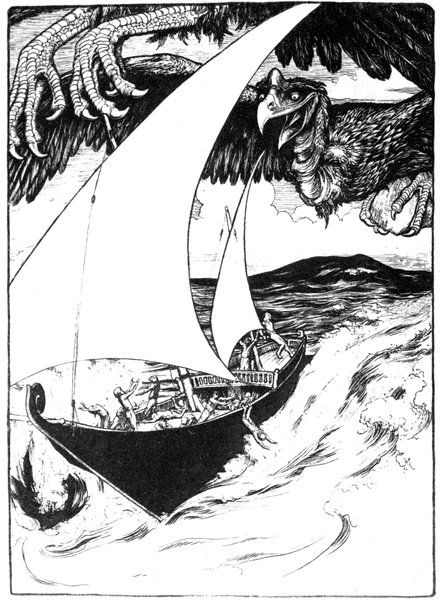 Know, O my brothers, that when I had been awhile on shore after my fourth voyage; and when, in my comfort and pleasures and merry-makings and in my rejoicing over my large gains and profits, I had forgotten all I had endured of perils and sufferings, the carnal man was again seized with the longing to travel and to see foreign countries and islands.[56] Accordingly I bought costly merchandise suited to my purpose and, making it up into bales, repaired to Bassorah, where I walked about the river-quay till I found a fine tall ship, newly builded with gear unused and fitted ready for sea. She pleased me; so I bought her and, embarking my goods in her, hired a master and crew, over whom I set certain of my slaves and servants as inspectors. A number of merchants also brought their outfits and paid me freight and passage-money; then, after reciting the Fatihah we set sail over Allah’s pool in all joy and cheer, promising ourselves a prosperous voyage and much profit. We sailed from city to city and from island to island and from sea to sea viewing the cities and countries by which we passed, and selling and buying in not a few till one day we came to a great uninhabited island, deserted and desolate, whereon was a white dome of biggest bulk half buried in the sands. The merchants landed to examine this dome, leaving me in the ship; and when they drew near, behold, it was a huge Rukh’s egg. They fell a-beating it with stones, knowing not what it was, and presently broke it open, whereupon much water ran out of it and the young Rukh appeared within. So they pulled it forth of the shell and cut its throat and took of it great store of meat. Now I was in the ship and knew not what they did; but presently one of the 49passengers came up to me and said, “O my lord, come and look at the egg that we thought to be a dome.” So I looked and seeing the merchants beating it with stones, called out to them, “Stop, stop! do not meddle with that egg, or the bird Rukh will come out and break our ship and destroy us.”[57] But they paid no heed to me and gave not over smiting upon the egg, when behold, the day grew dark and dun and the sun was hidden from us, as if some great cloud had passed over the firmament.[58] So we raised our eyes and saw that what we took for a cloud was the Rukh poised between us and the sun, and it was his wings that darkened the day. When he came and saw his egg broken, he cried a loud cry, whereupon his mate came flying up and they both began circling about the ship, crying out at us with voices louder than thunder. I called to the Rais and crew, “Put out to sea and seek safety in flight, before we be all destroyed.” So the merchants came on board and we cast off and made haste from the island to gain the open sea. When the Rukhs saw this, they flew off and we crowded all sail on the ship, thinking to get out of their country; but presently the two re-appeared and flew after us and stood over us, each carrying in its claws a huge boulder which it had brought from the mountains. As soon as the he-Rukh came up with us, he let fall upon us the rock he held in his pounces; but the master put about ship, so that the rock missed her by some small matter and plunged into the waves with such violence, that the ship pitched high and then sank into the trough of the sea and the bottom of the ocean appeared to us. Then the she-Rukh let fall her rock, which was bigger than that of her mate, and as Destiny had decreed, it fell on the poop of the ship and crushed it, the rudder flying into twenty pieces; whereupon the vessel foundered and all and everything on board were cast into the main.[59] As for me I struggled for sweet life, till Almighty Allah threw in my way one of the 50planks of the ship, to which I clung and bestriding it, fell a-paddling with my feet. Now the ship had gone down hard by an island in the midst of the main and the winds and waves bore me on till, by permission of the Most High, they cast me up on the shore of the island, at the last gasp for toil and distress and half dead with hunger and thirst. So I landed more like a corpse than a live man and throwing myself down on the beach, lay there awhile, till I began to revive and recover spirits, when I walked about the island and found it as it were one of the garths and gardens of Paradise. Its trees, in abundance dight, bore ripe-yellow fruit for freight; its streams ran clear and bright; its flowers were fair to scent and to sight and its birds warbled with delight the praises of Him to whom belong permanence and all-might. So I ate my fill of the fruits and slaked my thirst with the water of the streams till I could no more and I returned thanks to the Most High and glorified Him;——And Shahrazad perceived the dawn of day and ceased saying her permitted say.