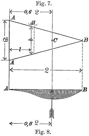 11. Bei Anwendung einer schlanken Flügelform ergäbe eine Flugfläche von 10 qm nach Fig. 80 eine Klafterbreite von 11 m bei einer größten Breite von 1,4 m.