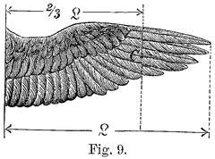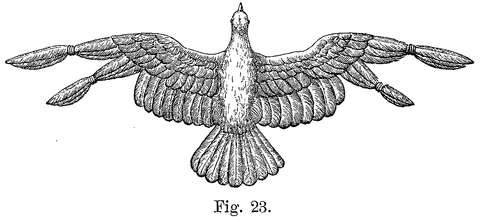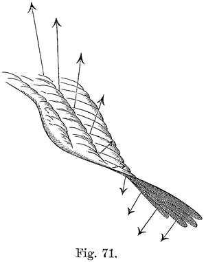 22. Das Vorwärtsziehen zur Unterhaltung der Fluggeschwindigkeit wird dadurch bewirkt, daß die Flügelspitzen oder Schwungfedern mit gesenkter Vorderkante abwärtsgeschlagen werden.