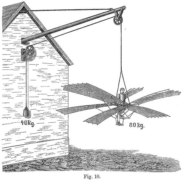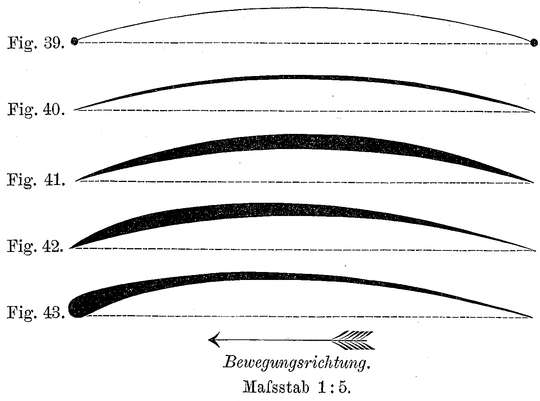 Indem wir beobachten, wie die Natur diese Fragen gelöst hat, und indem wir die ebene Flugfläche für den Flug größerer Wesen als ungeeignet verwerfen, fühlen wir jenen Alp nach und nach verschwinden, der uns vor der Beschaffung der zum Fliegen erforderlichen motorischen Kraft zurückschrecken machte. Wir werden gewahr, wie durch den gewölbten Naturflügel die Flugfrage sich ablöst von der reinen Kraftfrage und mehr in eine Frage der Geschicklichkeit sich verwandelt.