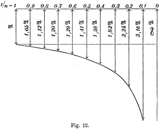 Zwischen diesen beiden bereits berechneten Grenzen der mechanischen Arbeit, die einmal gleich Null ist, wenn ein Segelwind von mindestens 10 m herrscht, und ihren größten Wert beim Ruderfluge in Windstille erhält, liegen nun alle jene Kraftaufwände, die bei Winden zwischen 0 m und 10 m Geschwindigkeit zum Fliegen erforderlich sind.