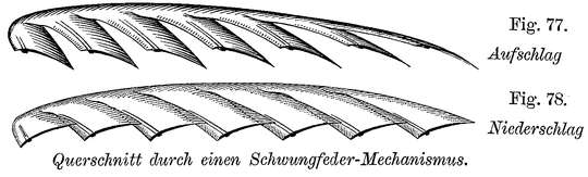 Die Federbekleidung kann daher, wenn sie dem Vogel auch die Entfaltung seiner Schwingen ermöglicht, und seine Gestalt zum leichteren Durchschneiden der Luft abrundet und glättet, kein besonderer Faktor zu seiner leichteren Erhebung in die Luft sein. Es ist vielmehr anzunehmen, daß bei den fliegenden Tieren die freie Erhebung von der Erde und das Beharren in der Luft, sowie die schnelle Fortbewegung durch die Luft mit Hülfe gewisser mechanischer Vorgänge stattfindet, welche möglicher Weise auch künstlich erzeugt und mittelst geeigneter Vorrichtungen auch von Wesen ausgeführt werden können, welche nicht gerade zum Fliegen geboren sind.