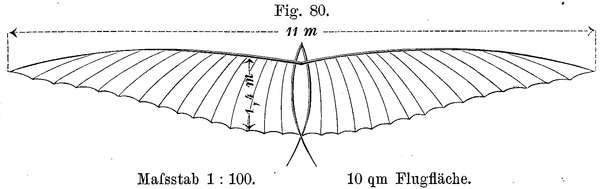 10. In kurzer, breiter Ausführung würden die Flügel eines Apparates von 10 qm Tragefläche eine Klafterbreite von 8 m bei 1,6 m größter Breite nach Fig. 79 erhalten.