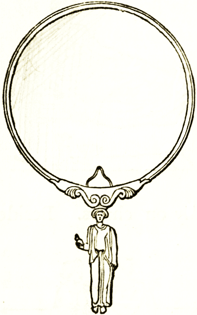 Mirrors of mixed metal alloys, silver, tin, and copper, have come down to our times in great numbers. They were made occasionally in pure silver, and in gold probably among the Greeks as they were in later times among the Romans. The cases are of bronze, and engraved with figure designs of the highest character. There is, however, no proof that these were used as furniture in houses, as in Rome. They are hand mirrors, and the description of them, as works of art, belongs rather to [pg 14] that of antique bronzes. The woodcut shows the usual type, with the richly ornamented handle.