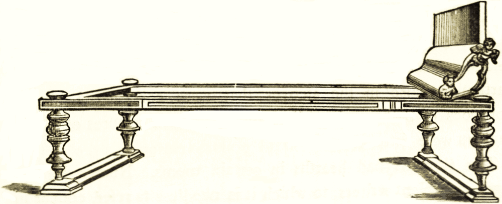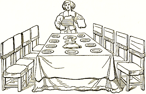 In the middle ages, as has been before said, tables were generally folding boards laid on trestles and moveable. The general disposition of the dining table was taken from those of abbeys and convents, and may be seen continued in some of our own colleges to this day. The principal table was on a raised platform or floor at the upper end of the hall, and thence called the "High" table. The guests sat on one side only, as in the traditional representations of the Last Supper, and the place of honour was the centre, the opposite side being left for the service. The principal person sat under a canopy or cloth of estate, either made for the occasion, or under a panelled canopy curving outward and permanent. Occasionally mediæval tables in England were of stone or marble. Of the former material a table is preserved belonging to the strangers' hall at Winchester; and a wooden one in the chapter-house at Salisbury. The tops of some [pg 126] old English tables are made with two thicknesses, the lower pulling out on either side to rest on supports drawn from the bed. A table of this description is kept at Hill hall, Essex; and the woodcut represents a folding table of the time of Elizabeth, long preserved at Flaxton Hall, in Suffolk. During the last century mahogany tables with delicate pierced galleries round the edge, and similar work to ornament the bed or frame, were made by Chippendale and his contemporaries. Many of them are light and graceful pieces of construction. Others were massively made with goat-footed legs that bulge well beyond the lines of the table top, which in these cases is often a slab of marble. The workmanship is admirable. Mahogany had then supplanted the use of oak for large tables.