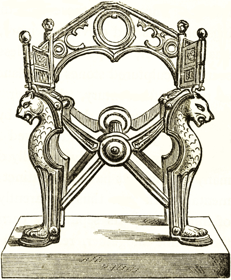 The woodcut is from the chair of St. Peter in Rome, the oldest and most interesting relic of antique furniture in existence; that is, of furniture made of wood and kept in use from the days of ancient Rome. But it has had repairs and additions, and a description of it shall be referred to in another section.