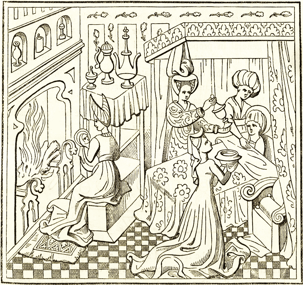 The beds of the early middle ages in England had testers with curtains, often of valuable material. These slid on rings on an iron rod. Sometimes the rod, with a frame to sustain it, was on one or on three sides of the bed, and the tester wanting. Sometimes the beds were slung on uprights, as cots are at sea. No great expense was incurred in the framework till the fifteenth and sixteenth centuries. The splendour of state beds, or those of great people, consisted in the curtains, which were occasionally taken down, and hung up in churches on festivals. In the illuminations of manuscripts and in pictures representing scenes in which there is a bed, we find the tester strained by cords to the sides of the room or to the ceiling, as in the accompanying woodcut. The curtains ran round this frame, as in our modern four-posters; but we see them hoisted out of the way during the daytime, not round a post, only raised beyond reach.